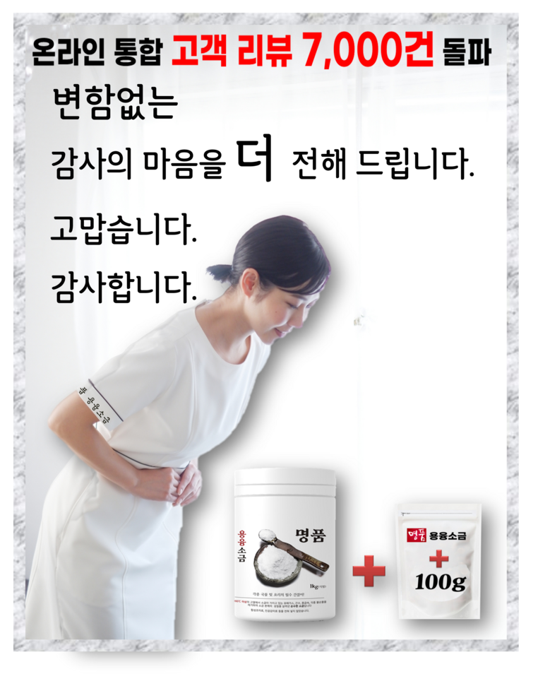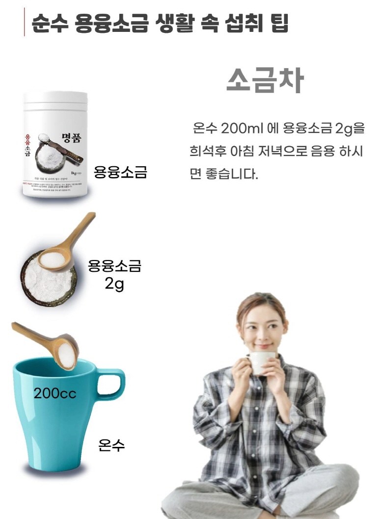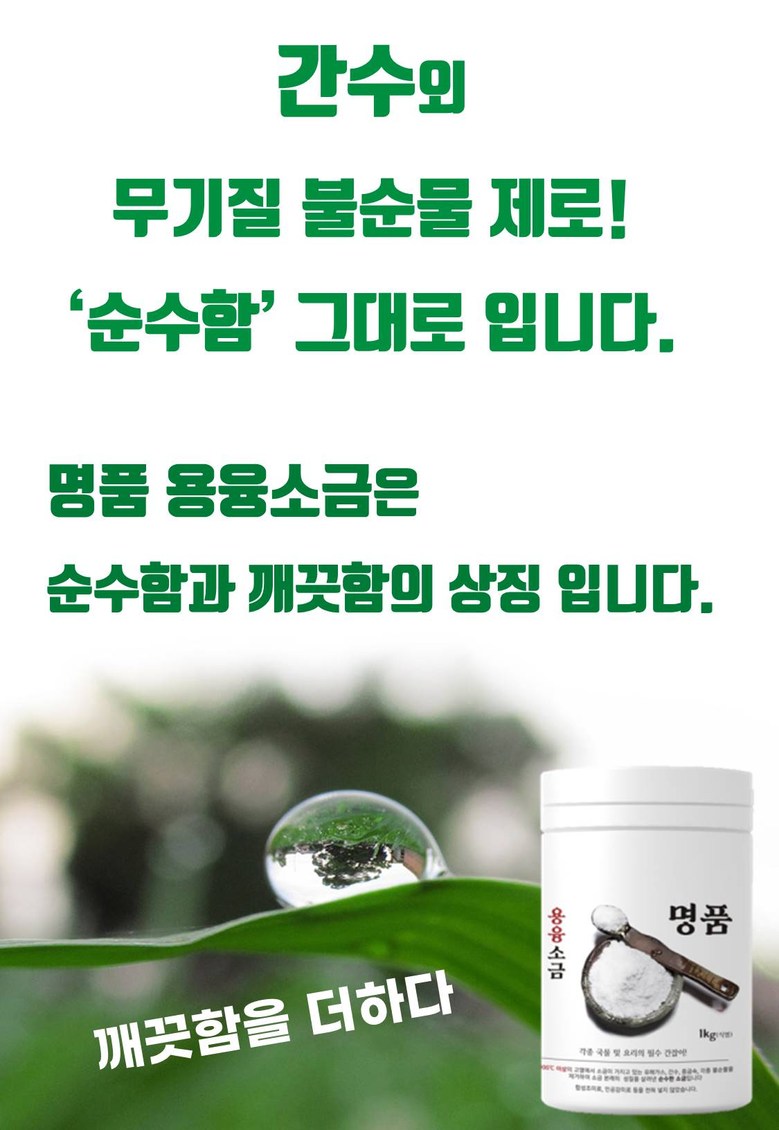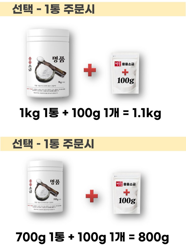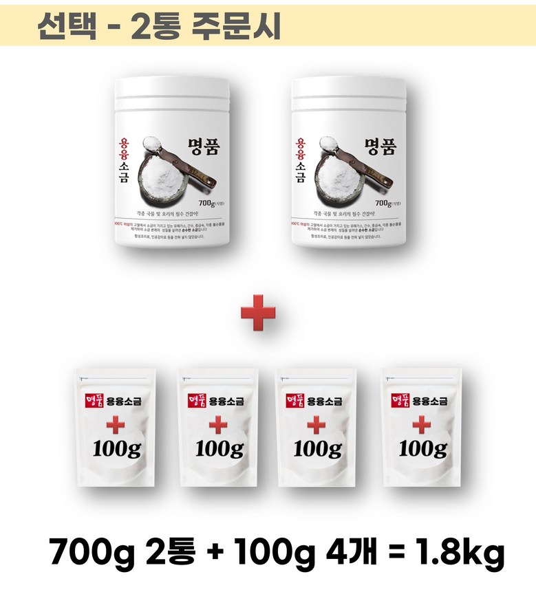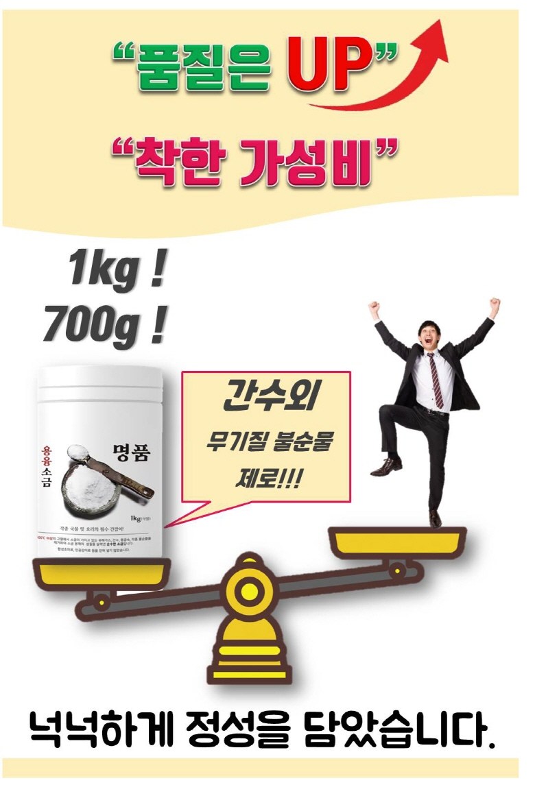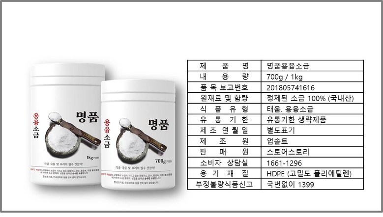 | 포장단위별 내용물의 용량(중량), 수량 | 1kg / 700g | 원재료명 및 함량 | 국내산 정제된 소금 100% |
