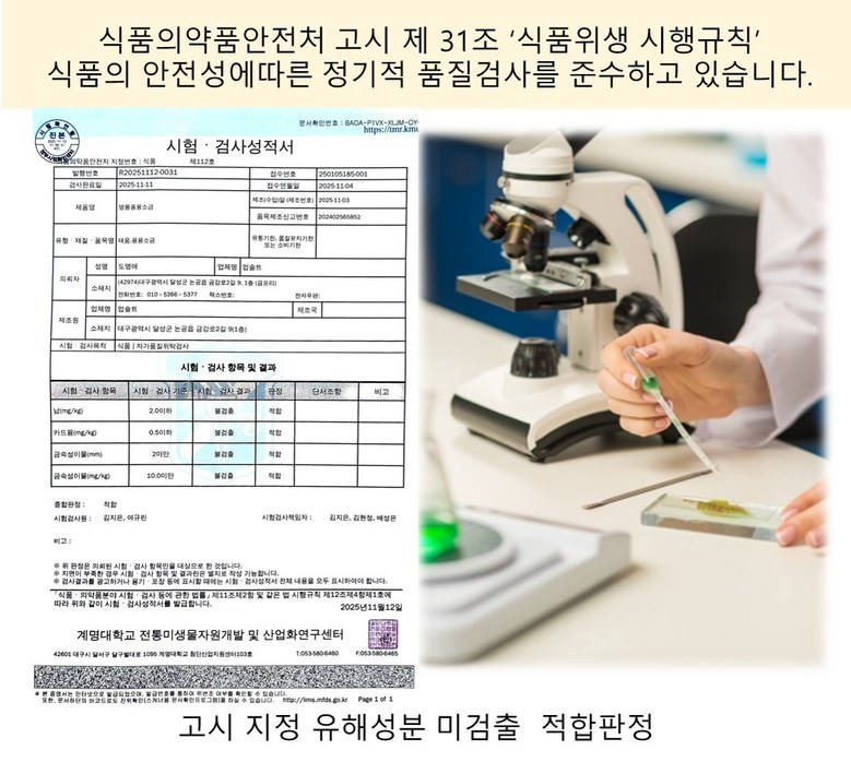 | 생산자 및 소재지 | 경북칠곡 | 제조연월일, 소비기한 또는 품질유지기한 | 유통기한 없음 |