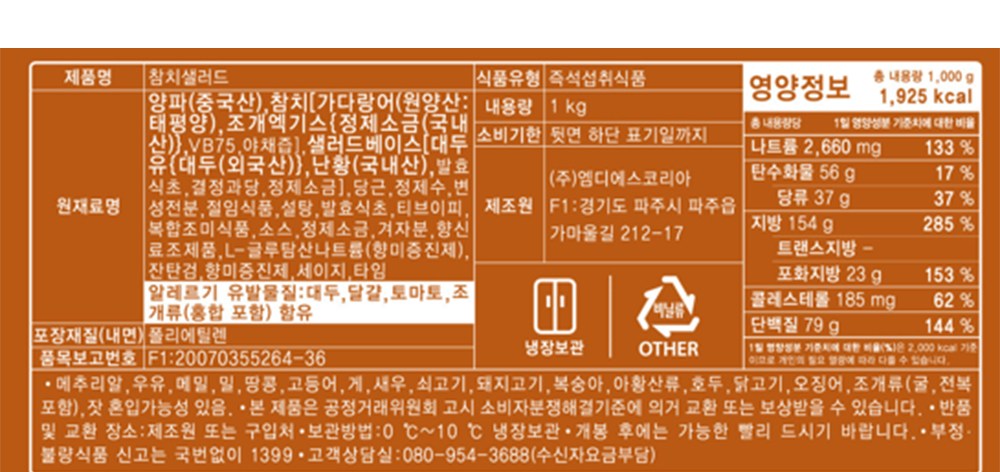 | 제품명 | 참치 샐러드 | 식품의 유형 | 즉석섭취식품 |