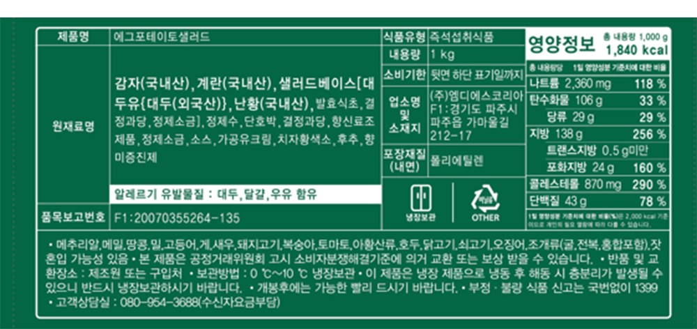 | 제품명 | 에그포테이토 샐러드 | 식품의 유형 | 즉석섭취식품 |