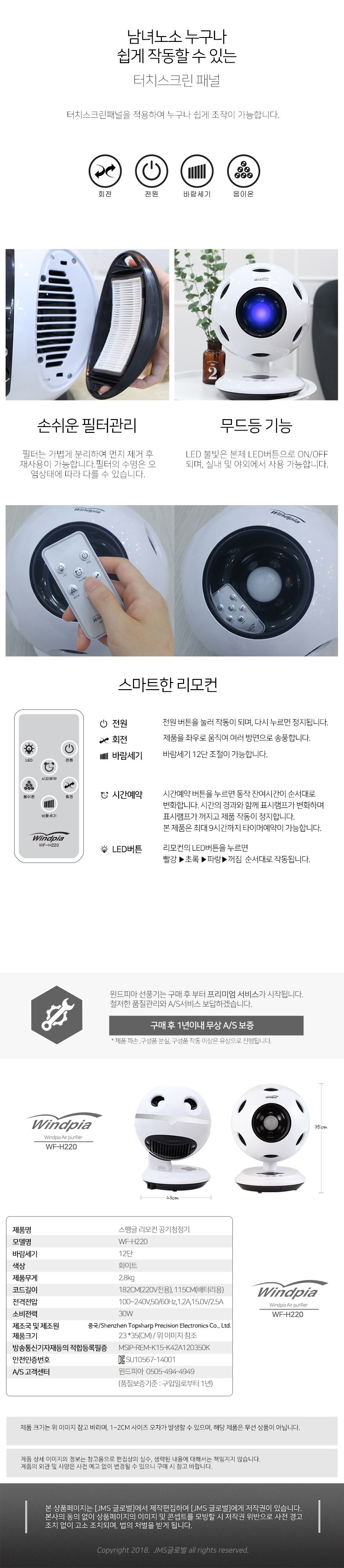 | 품명 및 모델명 | 스팽글리모컨공기청정기[WF-H220] | KC 인증정보 | 어댑터:MSIP-REM-K15-K42A120350K, SU10567-14001 / 본품 : MSIP-REI-J7M-WFH2 |