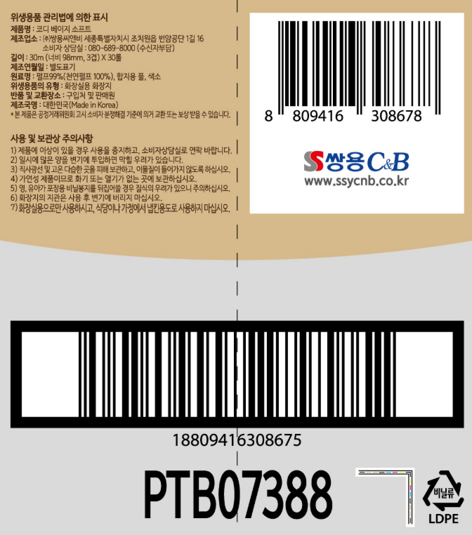 | 품명 및 모델명 | 코디 베이지소프트 3겹 천연펄프 롤화장지 | 인증/허가 사항 | 위생용품 |