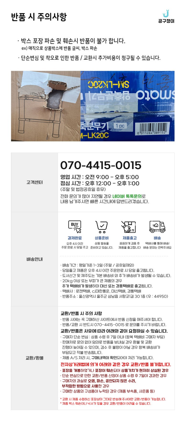 - ㆍ모니터 해상도의 차이로 인해 색상이나 이미지가 실제와 달라, 고객이 단순 변심으로 교환/반품을 무료로 요청하는 경우