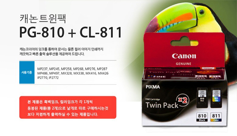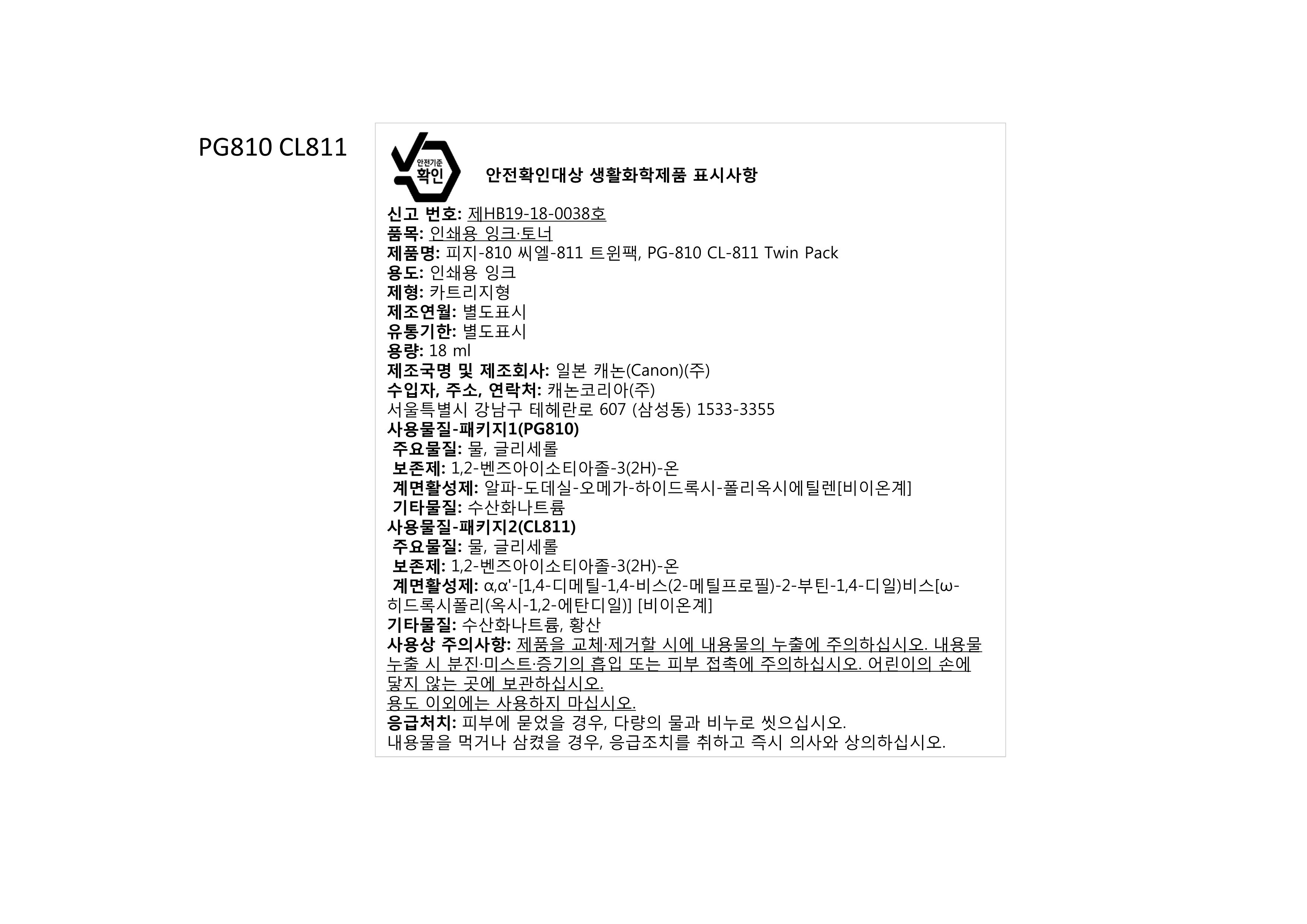 | 품목 및 제품명 | 인쇄용 잉크·토너 / 피지-810 씨엘-811 트윈팩, PG-810 CL-811 Twin Pack | 용도(표백제의 경우 계열을 함께표시) 및 제형 | 인쇄용 잉크 / 비분사형-카트리지형 |