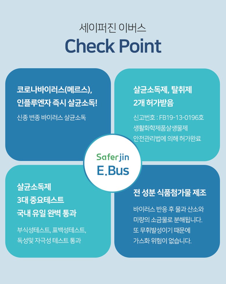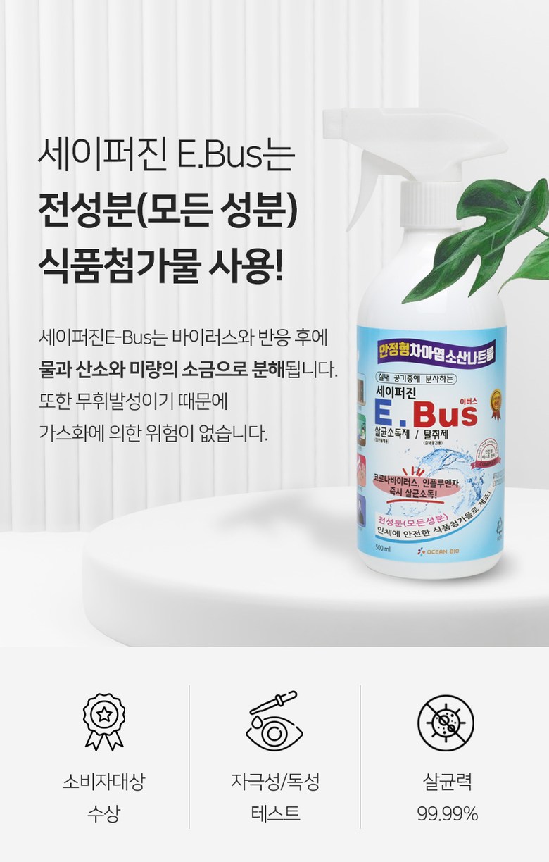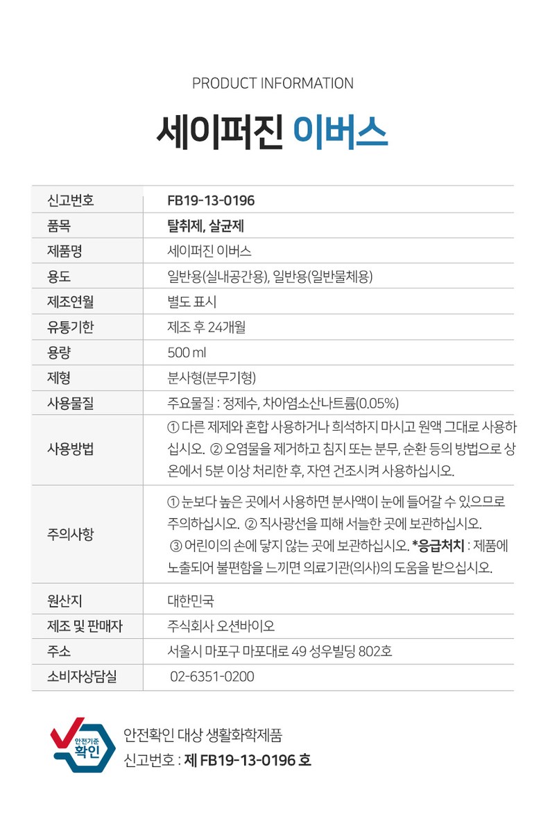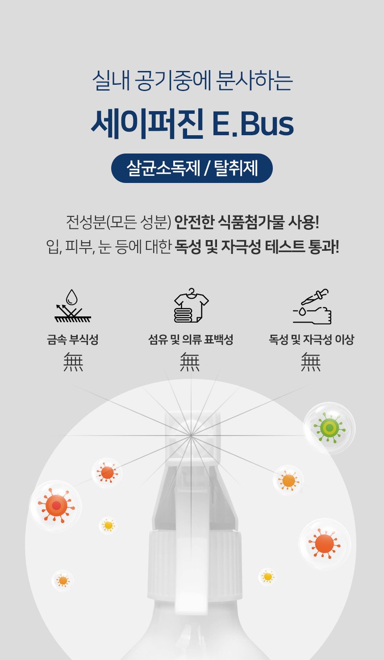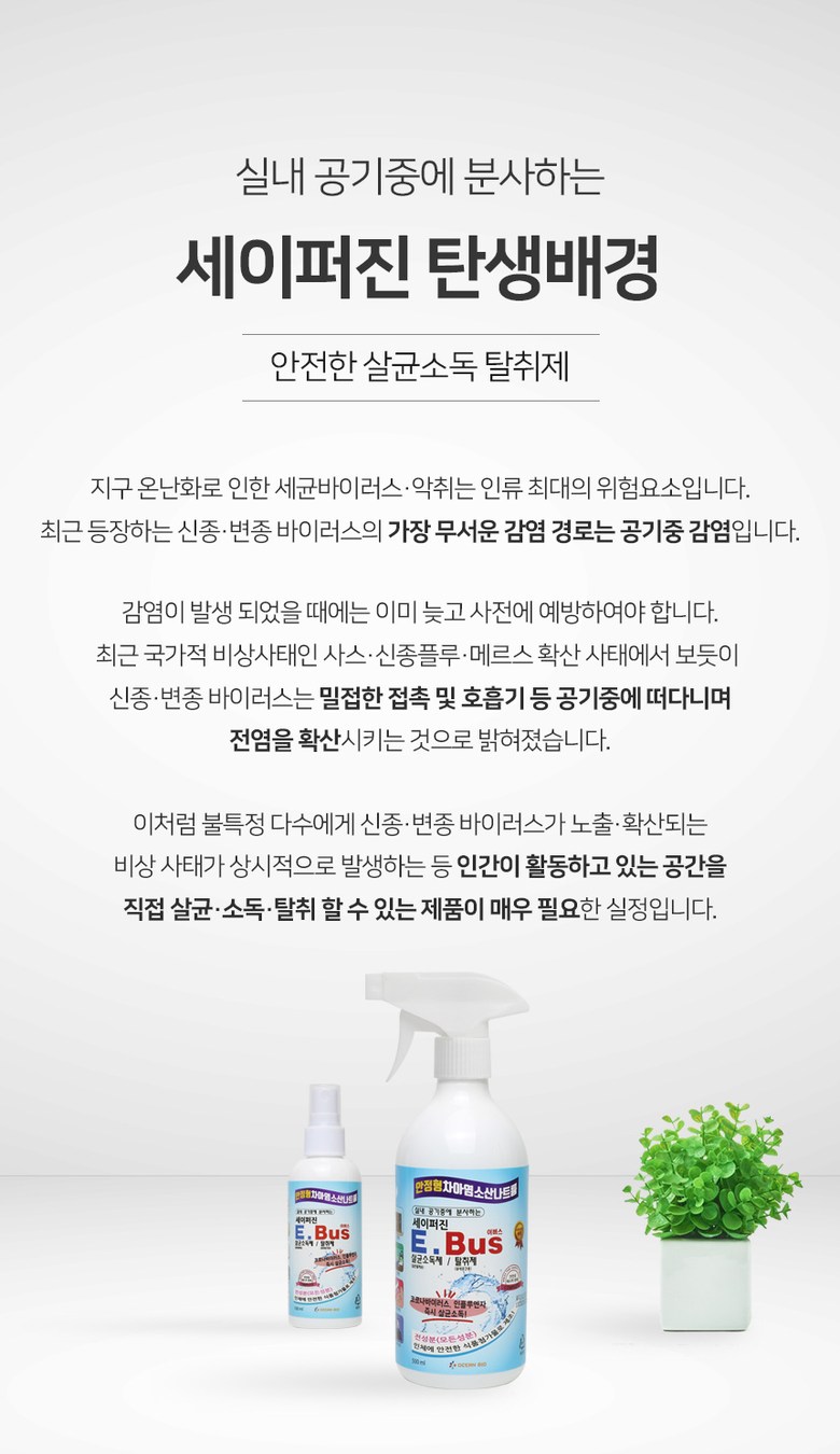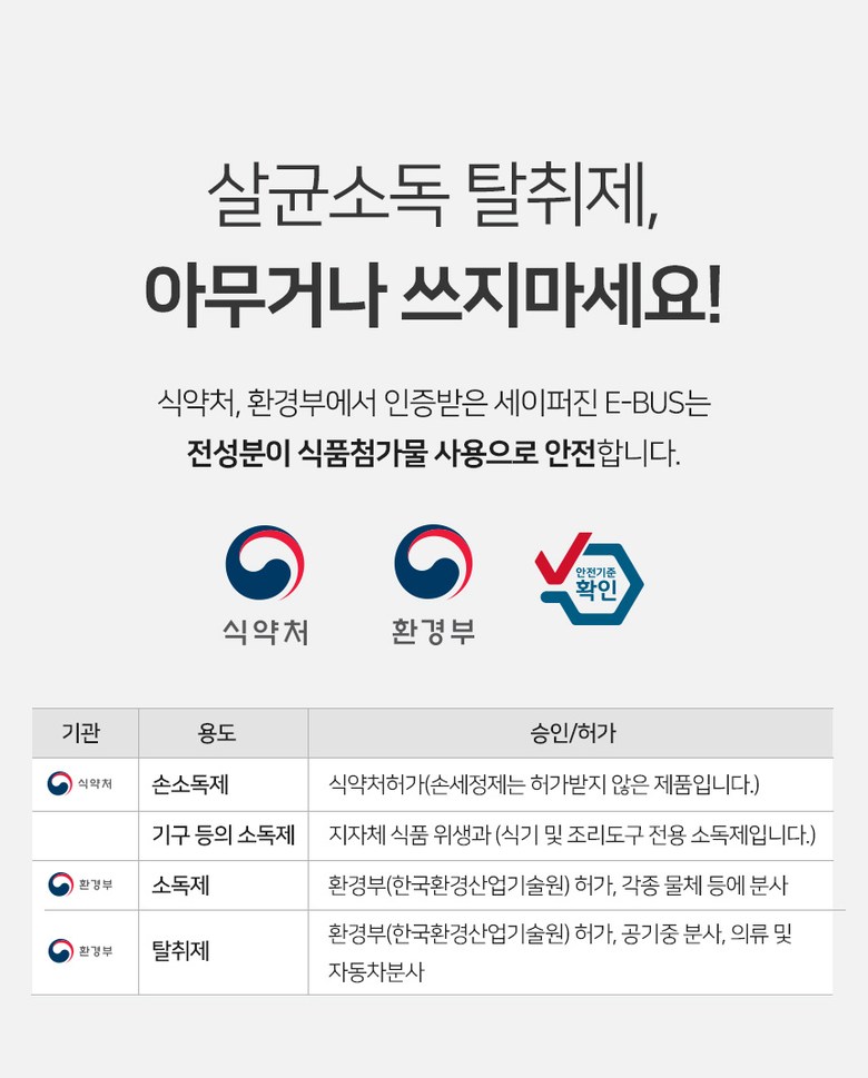 | 품명 및 모델명 | 세이퍼진 E-BUS 500ml | 인증/허가 사항 | 2019년 08월 환경부에서 살균소독제, 탈취제로 허가를 받은 제품입니다. 허가번호 : FB19-13-0196 |
