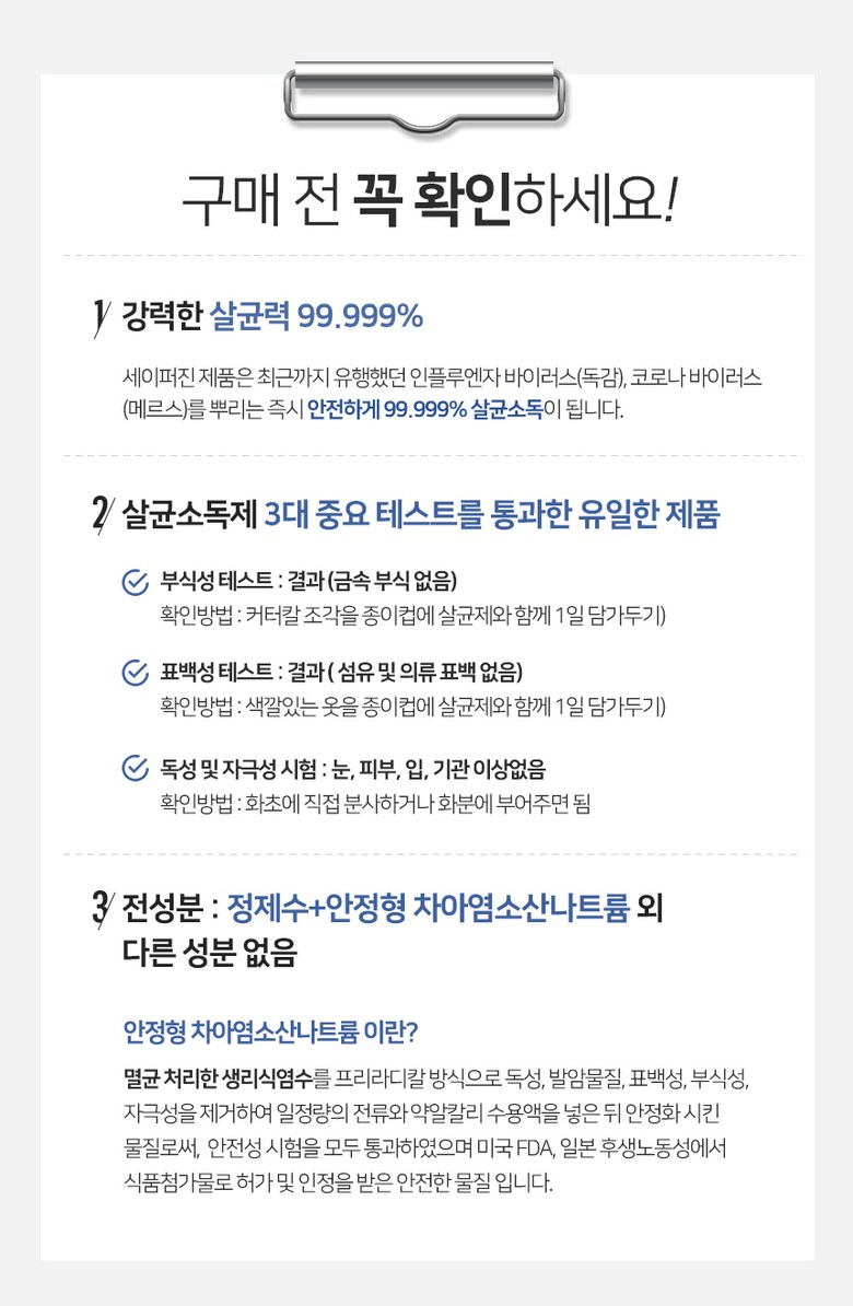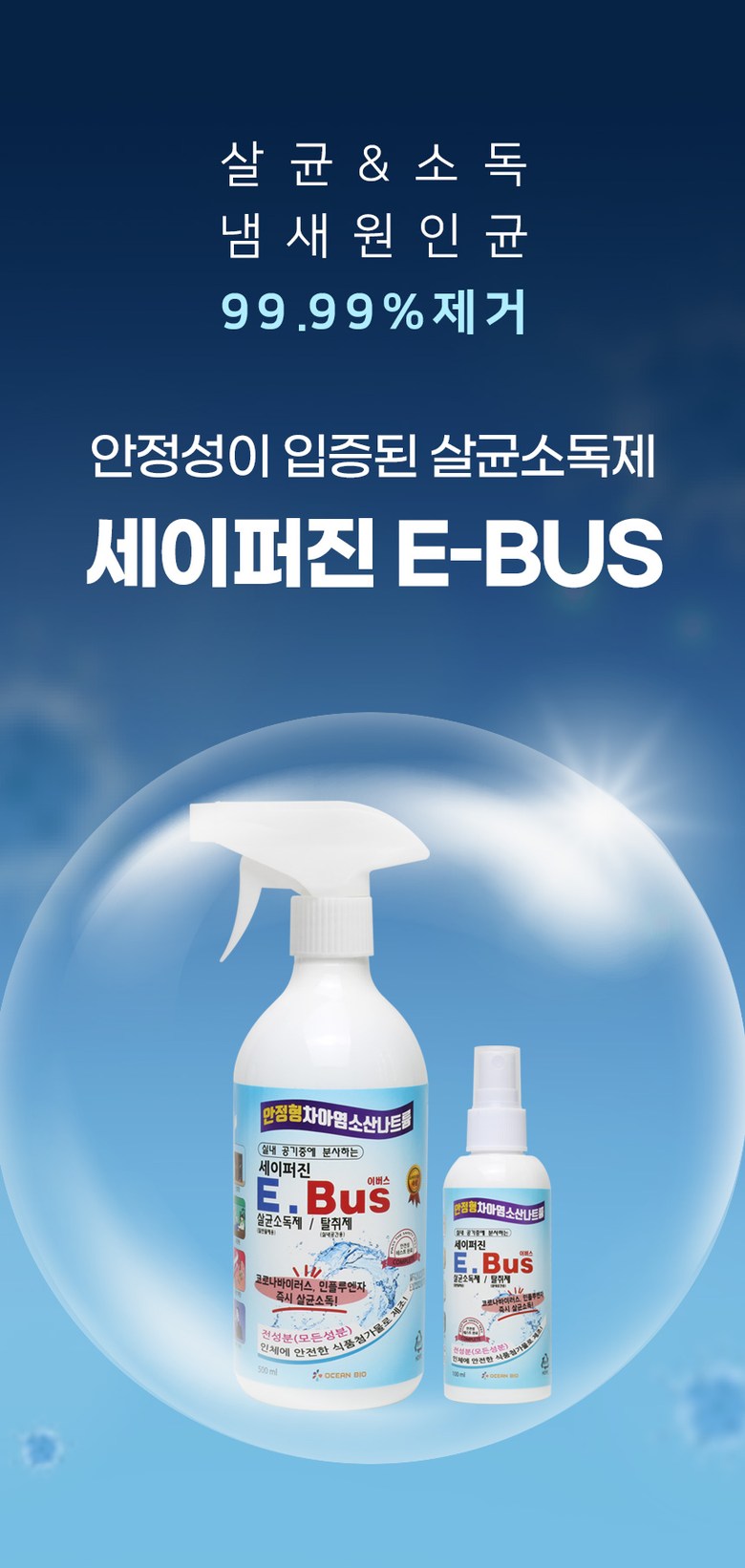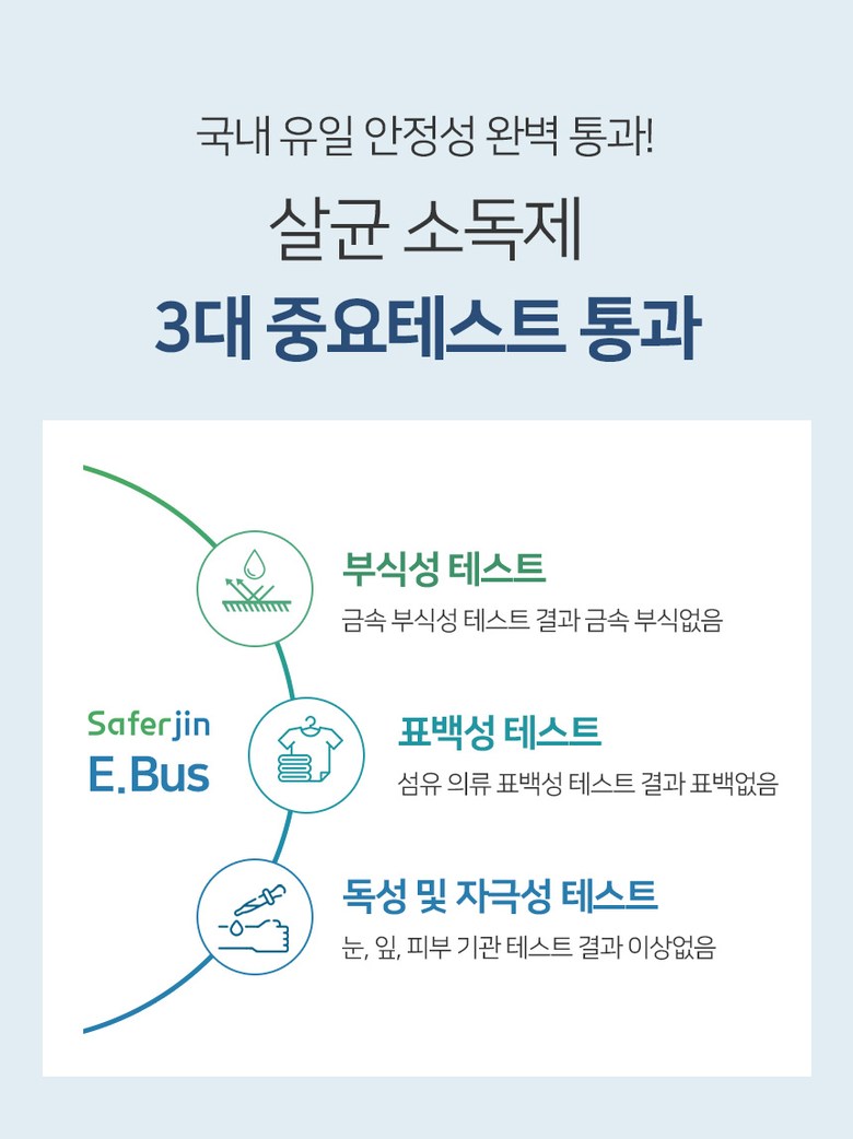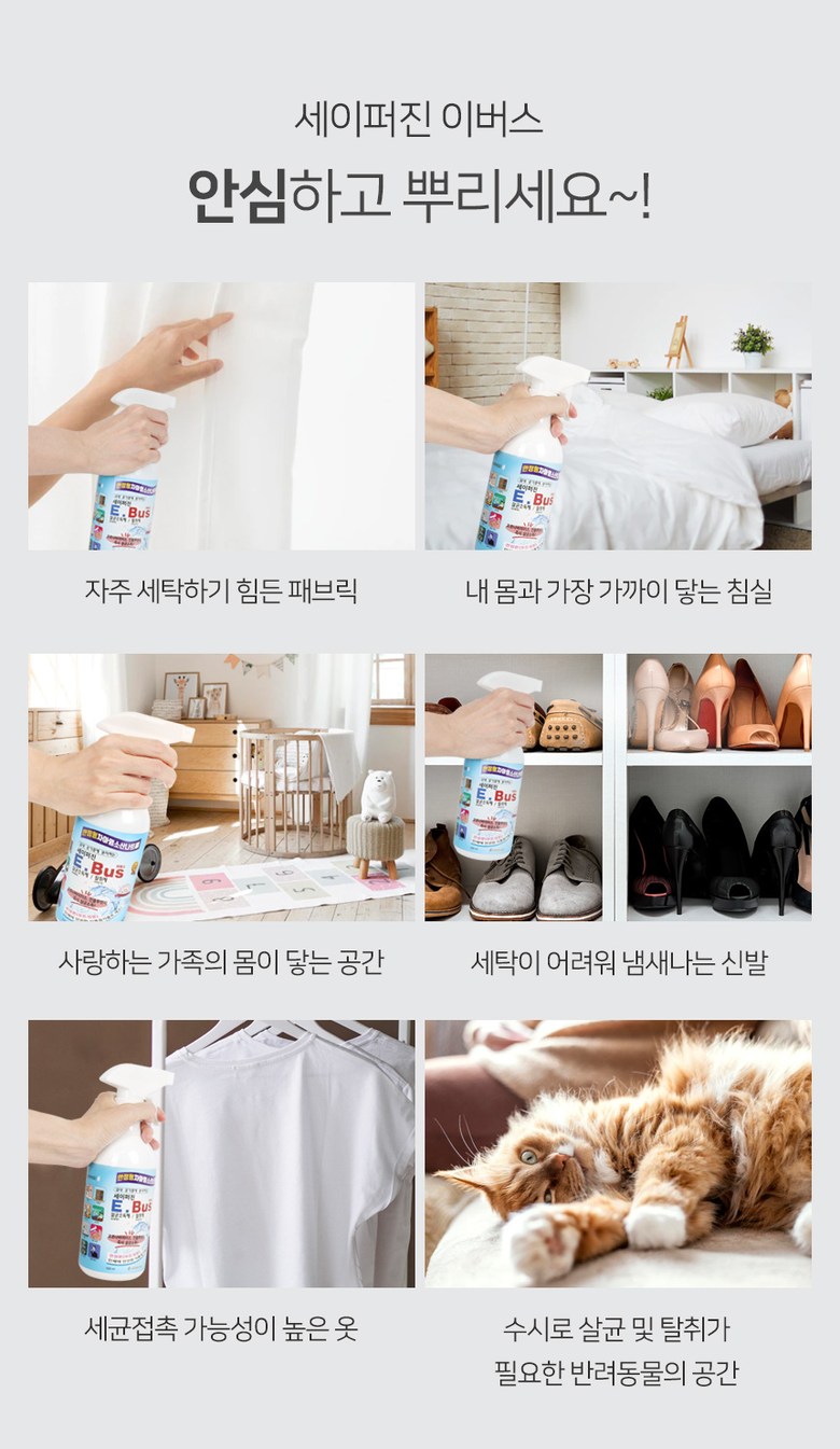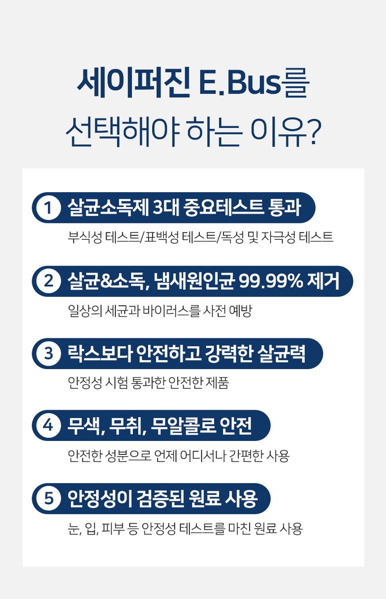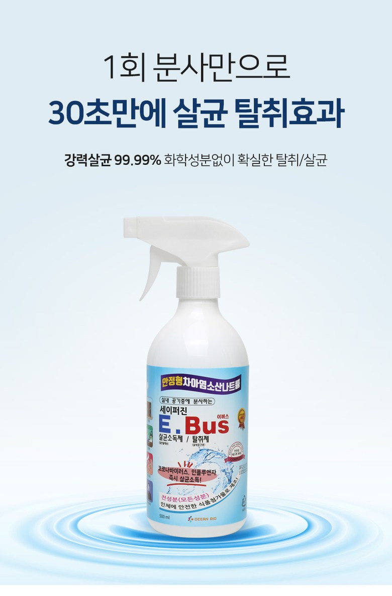 | 품명 및 모델명 | 세이퍼진 E-BUS 500ml | 인증/허가 사항 | 2019년 08월 환경부에서 살균소독제, 탈취제로 허가를 받은 제품입니다. 허가번호 : FB19-13-0196 |