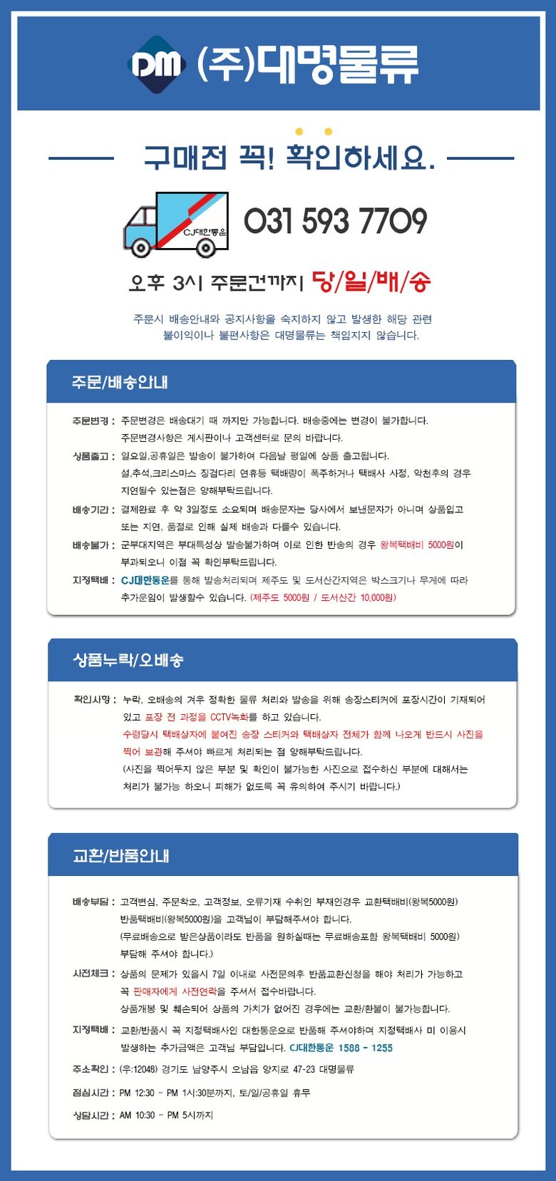 - ㆍ모니터 해상도의 차이로 인해 색상이나 이미지가 실제와 달라, 고객이 단순 변심으로 교환/반품을 무료로 요청하는 경우