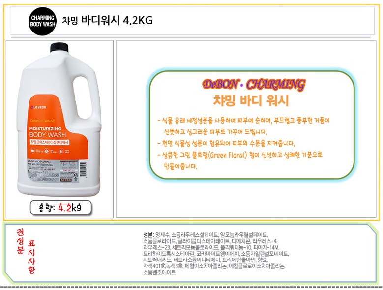 | 품명 및 모델명 | 챠밍 모이스처라이징 바디워시 4.2KG | 인증/허가 사항 | 해당사항 없음 |