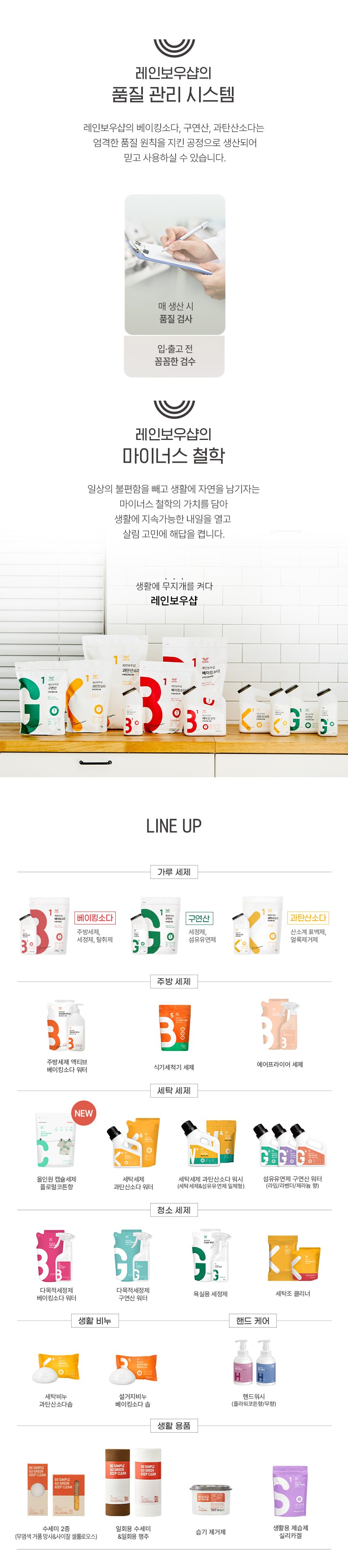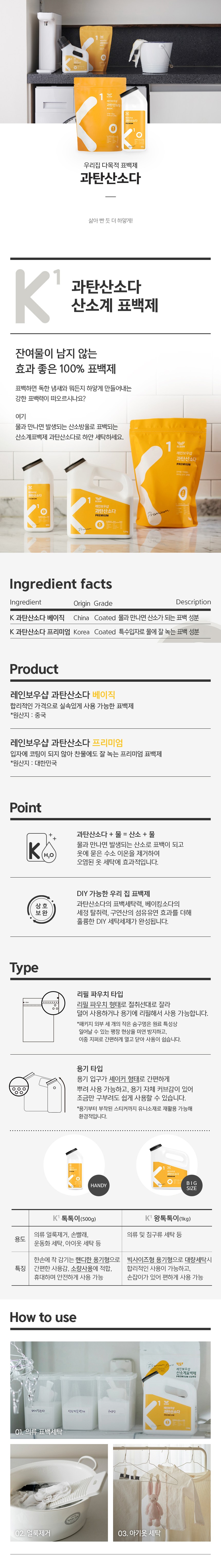 | 품목 및 제품명 | 표백제/레인보우샵 과탄산소다 베이직 | 용도(표백제의 경우 계열을 함께표시) 및 제형 | 섬유용-과탄산나트륨계,신발용-과탄산나트륨계/비분사형-분말형 |