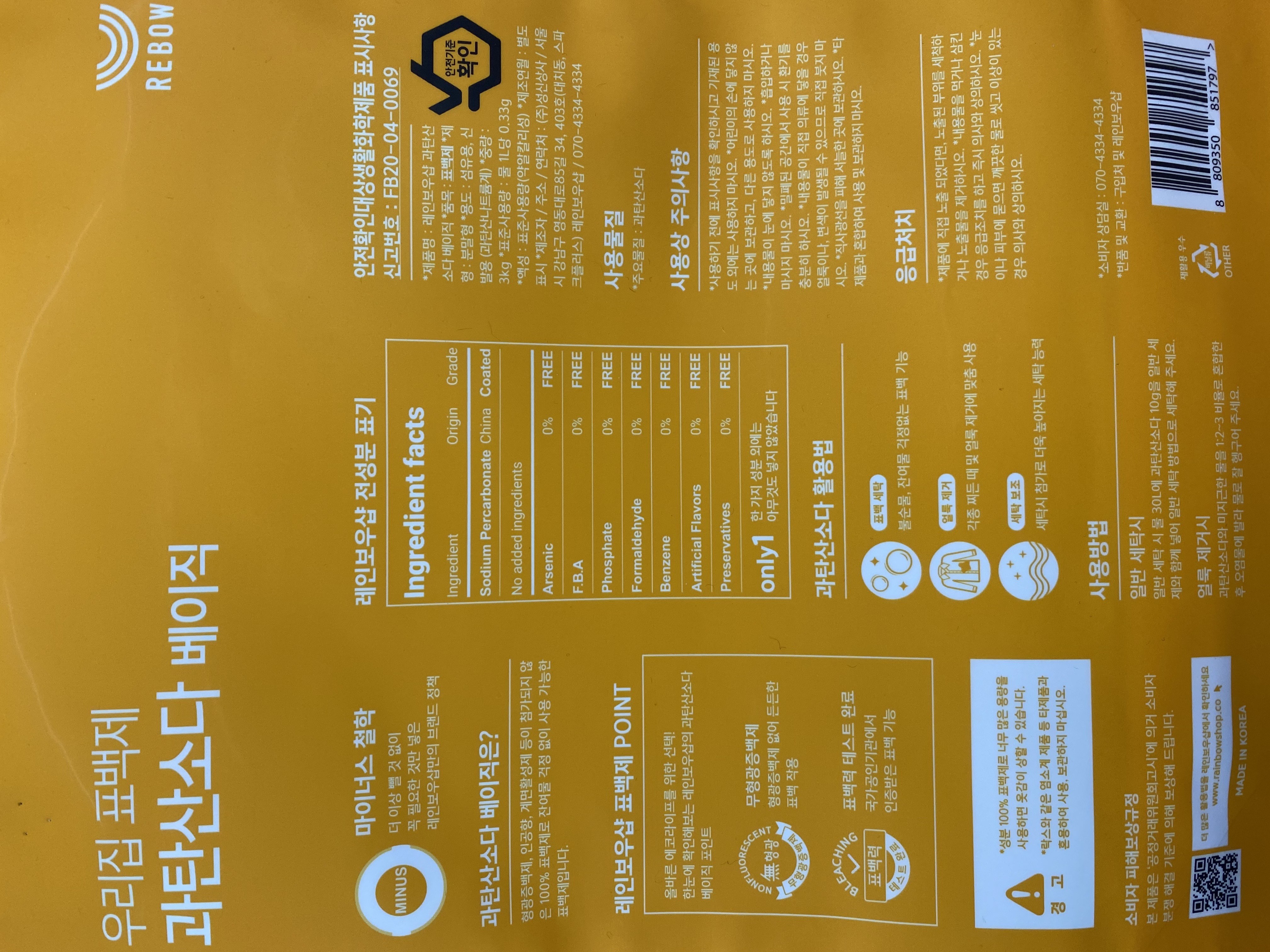 | 품목 및 제품명 | 표백제/레인보우샵 과탄산소다 베이직 | 용도(표백제의 경우 계열을 함께표시) 및 제형 | 섬유용-과탄산나트륨계,신발용-과탄산나트륨계/비분사형-분말형 |