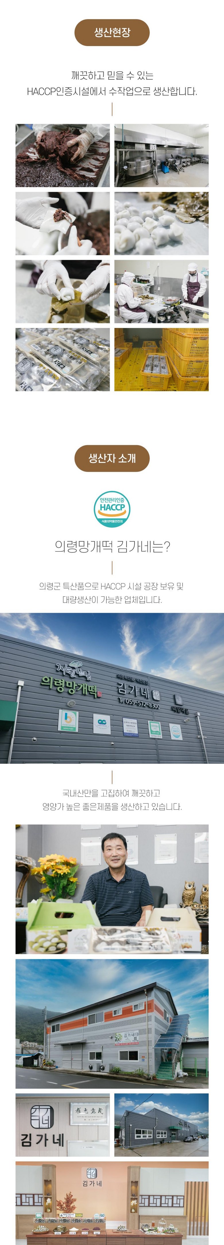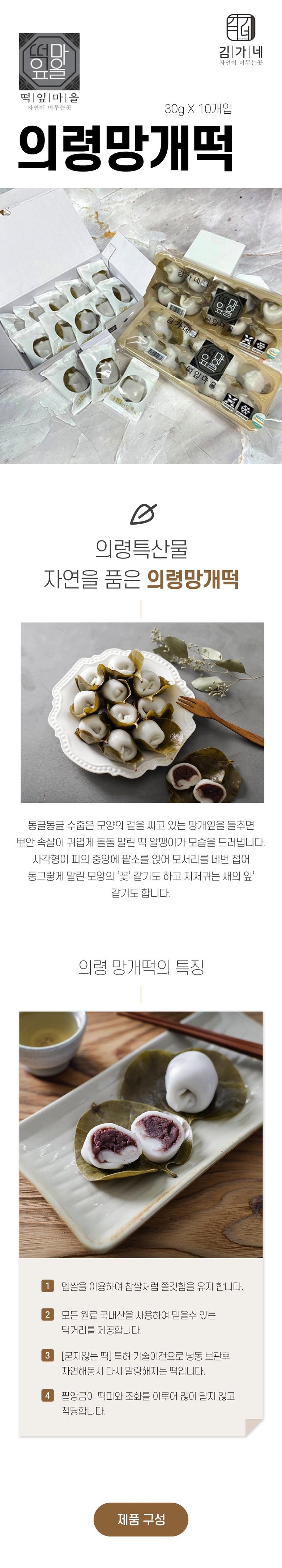| 생산자 및 소재지 | 의령망개떡김가네 / 경상남도의령군 | 제조연월일, 소비기한 또는 품질유지기한 | 주문완료후 제작 / 냉장 1~2일 / 냉동 12개월 |