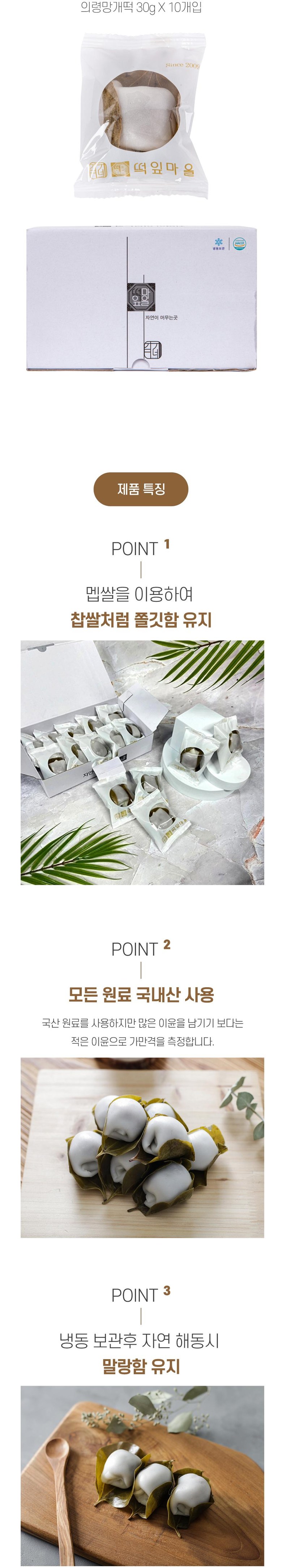 | 포장단위별 내용물의 용량(중량), 수량 | 10개/1팩 300g | 원재료명 및 함량 | 쌀(국내산)62.8%,천일염,2%,청미래(망개잎)1%,팥앙금(국내산)33%,트레할로스,옥수수전분 |