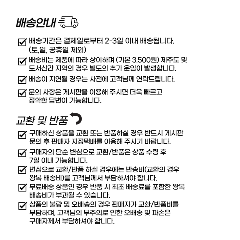 | 교환/반품 비용 (왕복비용) | 6,000원 - 단, 고객 변심의 경우에만 발생 - 도서산간 및 일부 지역 추가비용 발생 |