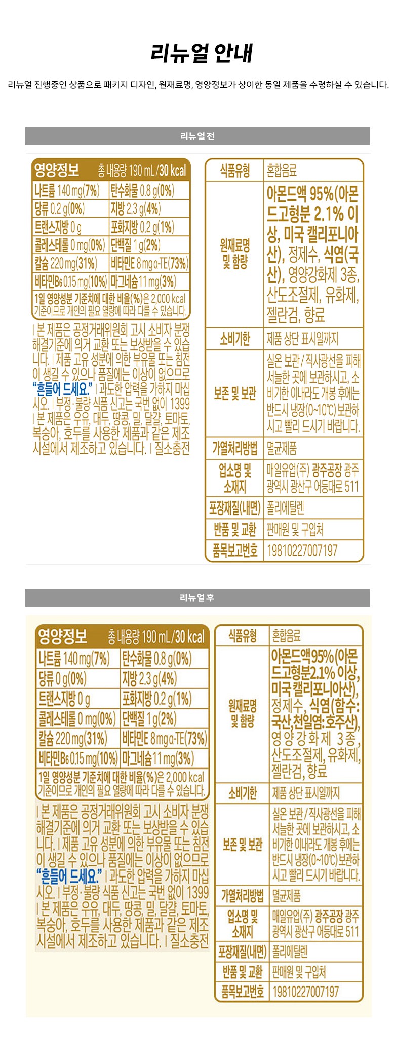 | 제품명 | 아몬드브리즈 언스위트 | 식품의 유형 | 컨텐츠 참조 |