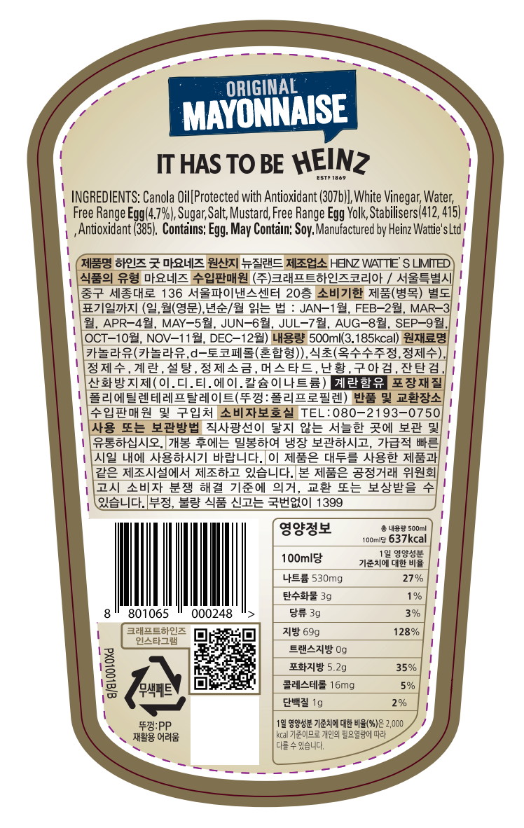 | 제품명 | 하인즈 굿 마요네즈 | 식품의 유형 | 마요네즈 |