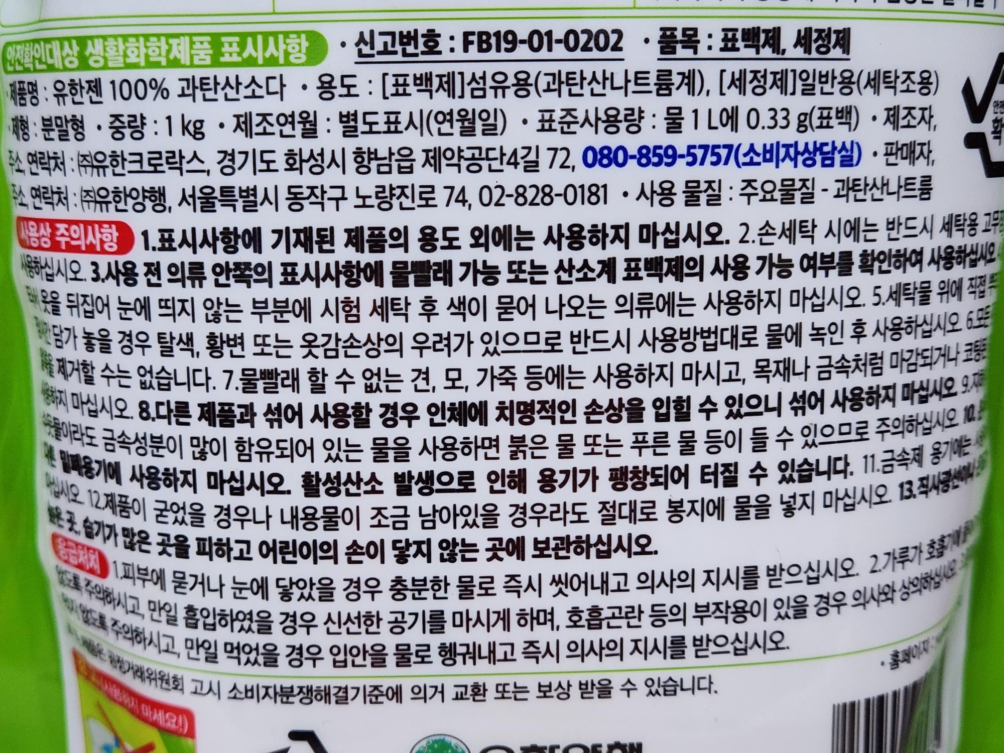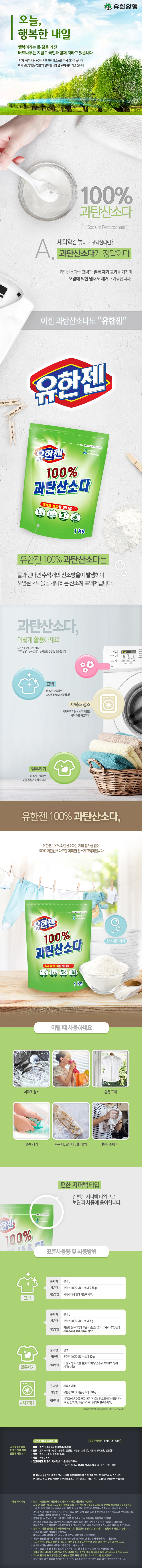 | 품목 및 제품명 | 세정제,표백제 / 유한젠 100% 과탄산소다 | 용도(표백제의 경우 계열을 함께표시) 및 제형 | [표백제] 섬유용(과탄산나트륨계) [세정제] 일반용(세탁조용) / 비분사형(분말형) |