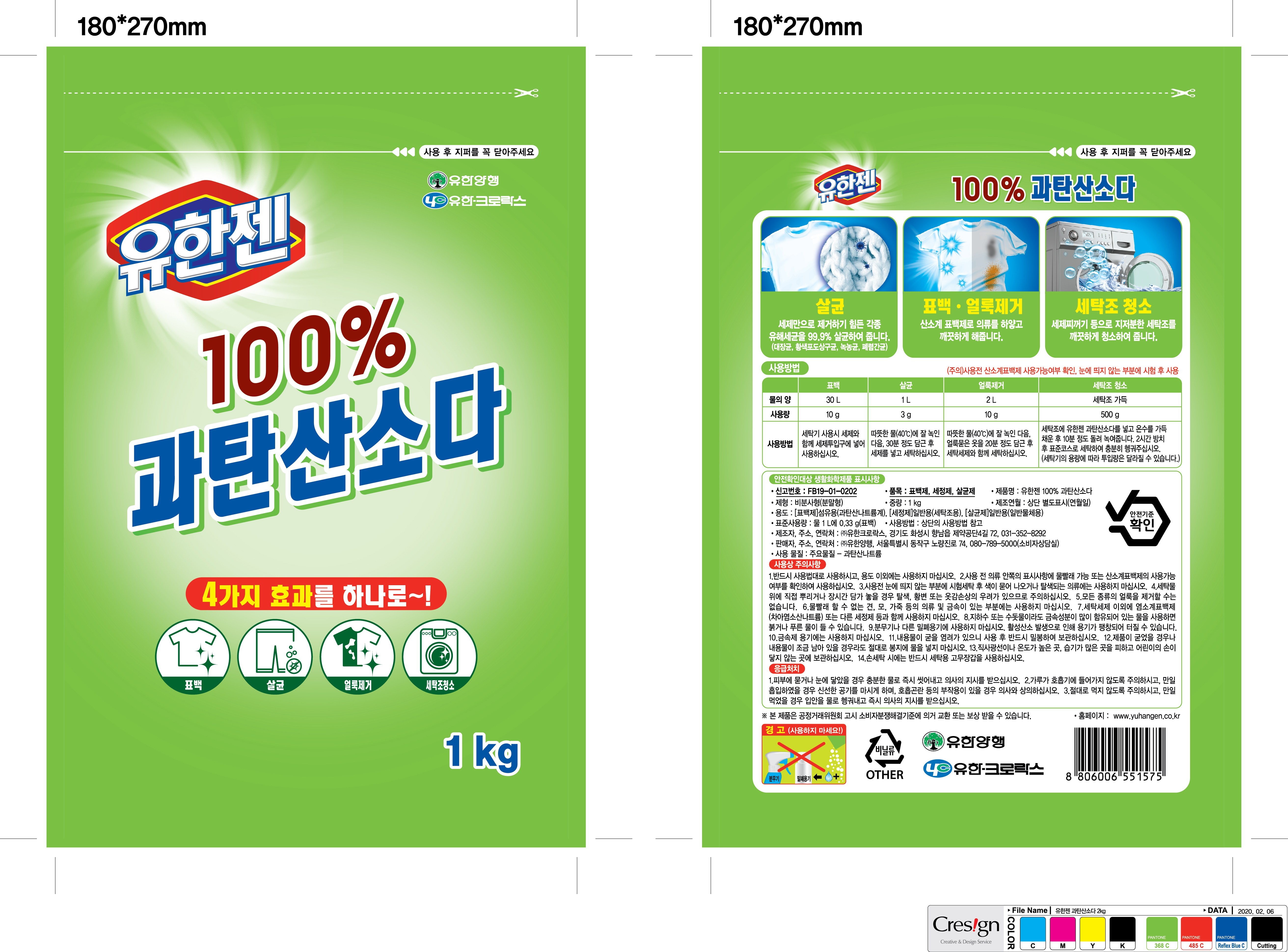 | 품목 및 제품명 | 세정제,살균제,표백제 / 유한젠 100% 과탄산소다 | 용도(표백제의 경우 계열을 함께표시) 및 제형 | [표백제] 섬유용(과탄산나트륨계) [세정제] 일반용(세탁조용) [살균제] 일반용(일반물체용) / 비분사형(분말형) |