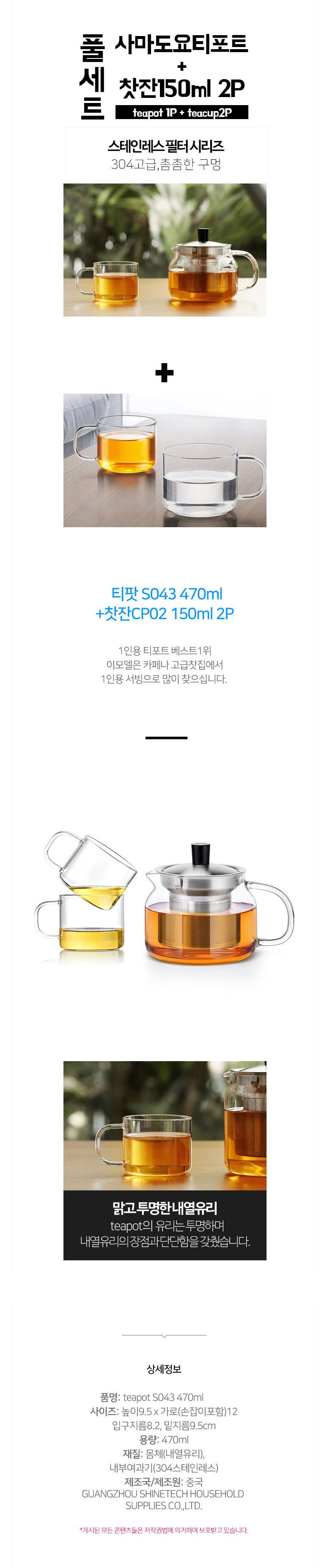 | 구성품 | 몸체1개+스텐여과기개+뚜껑1개+찻잔2개+박스 | 크기 | 컨텐츠 참조 |