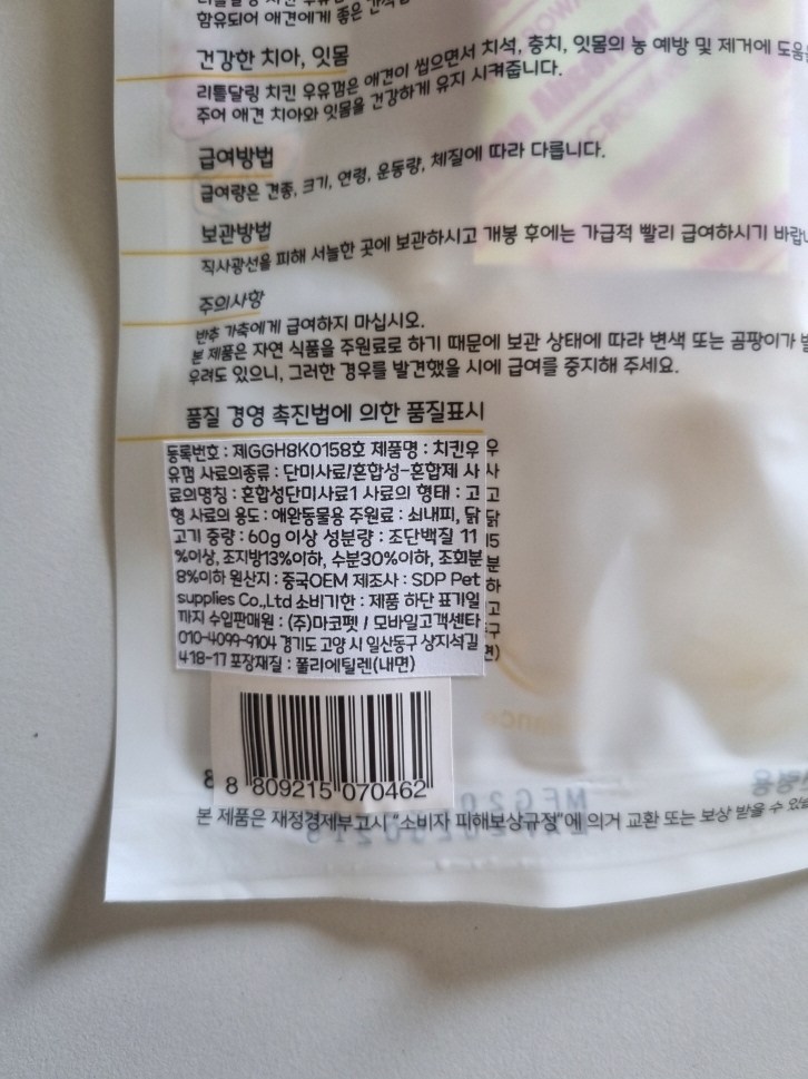 | 품명 및 모델명 | 치킨우유껌 | 인증/허가 사항 | 사료관리법에 따른 성분등록번호 : 컨텐츠 참조 |