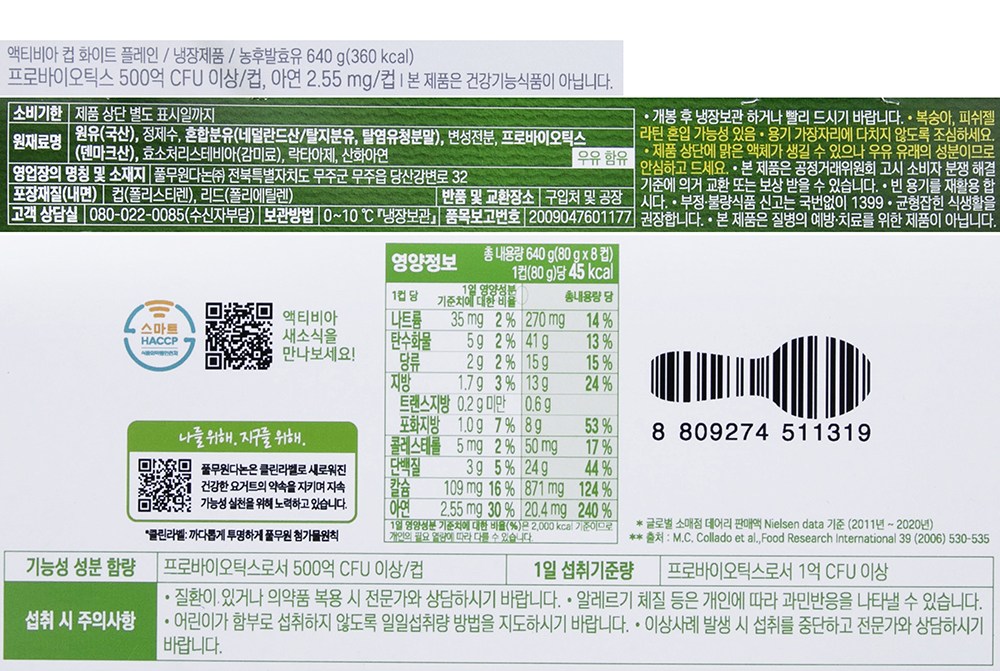 | 제품명 | 액티비아 컵 화이트 플레인 | 식품의 유형 | 컨텐츠 참조 |