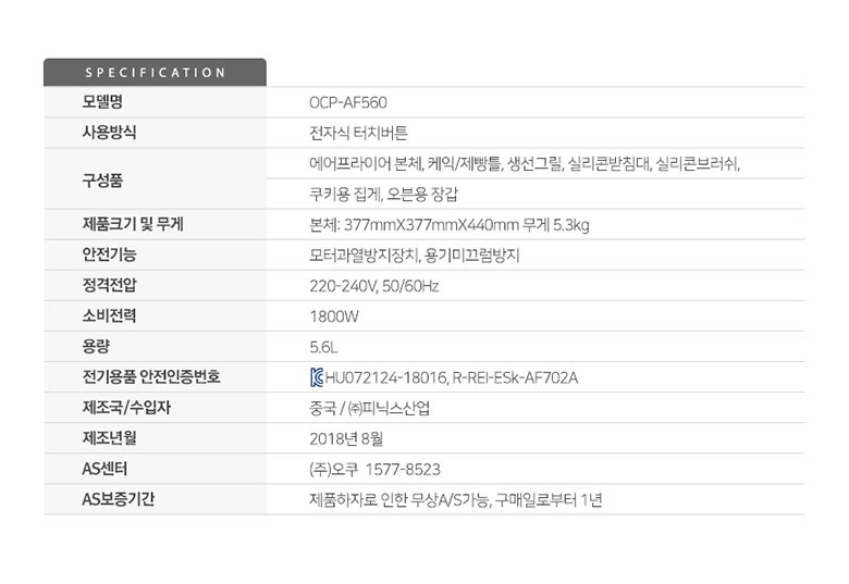 | 품명 및 모델명 | 오쿠 에어프라이어 OCP-AF560 | KC 인증정보 | HU072124-18016B, R-REI-ESk-AF702A |
