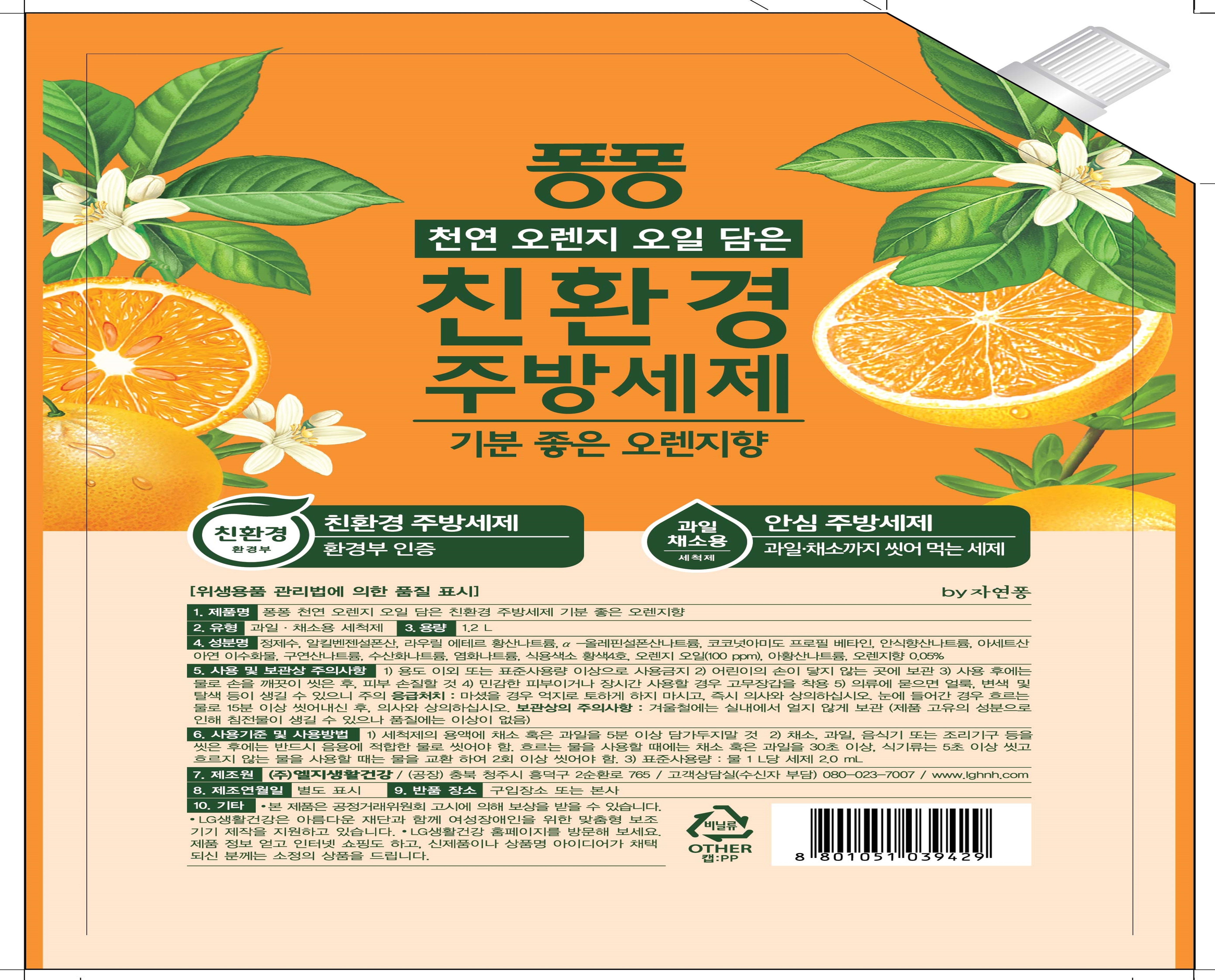| 품명 및 모델명 | 퐁퐁 천연 오렌지 오일 담은 친환경 주방세제 기분 좋은 오렌지향 | 인증/허가 사항 | 위생용품 |