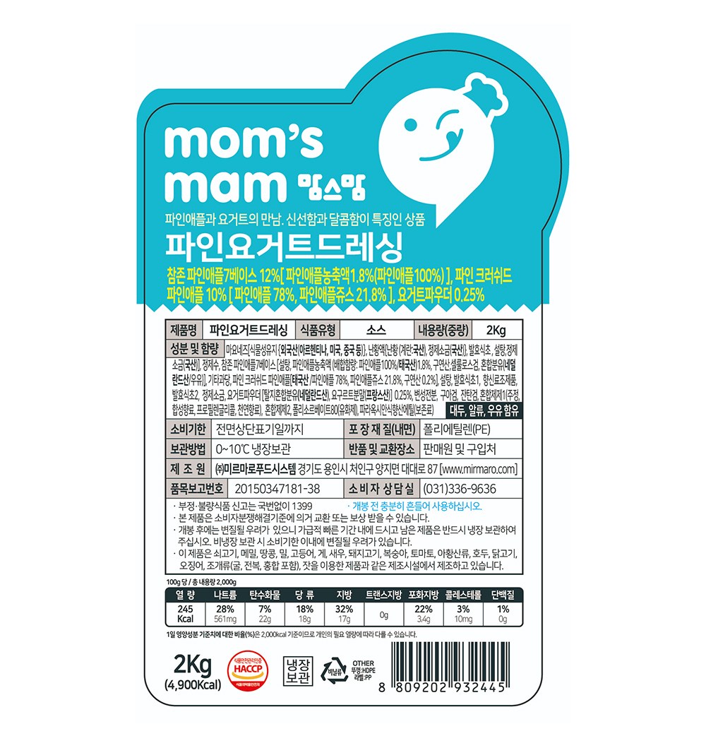 달콤한 파인애플과 산뜻한 요거트의 풍미를 한 번에 느낄 수 있는 맘스맘의 파인요거트드레싱이에요. 품질 좋은 계란과 정제소금으로 만든 마요네즈를 넣어 더욱 고소하고 신선한 풍미를 느낄 수 있죠. 기분 좋은 상큼함을 가득 느낄 수 있는 파인요거트드레싱으로 다양하게 요리해보세요. 야채샐러드, 두부 샐러드 등 각종 샐러드의 드레싱으로 활용하면 입맛 돋우는 싱그러운 음식이 완성될 거예요.