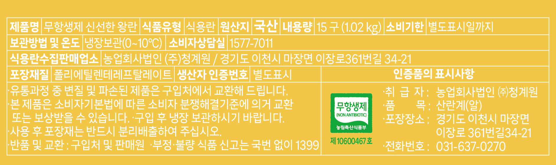 | 품목 또는 명칭 | 곰곰 무항생제 신선한 왕란 | 포장단위별 내용물의 용량(중량),수량,크기 | 15구 |