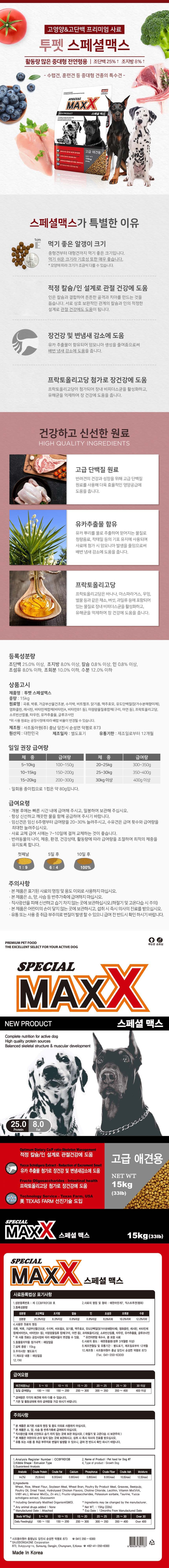 | 품명 및 모델명 | 스페셜맥스 | 인증사항 | 사료관리법에 따른 성분등록번호 : 컨텐츠 참조 |