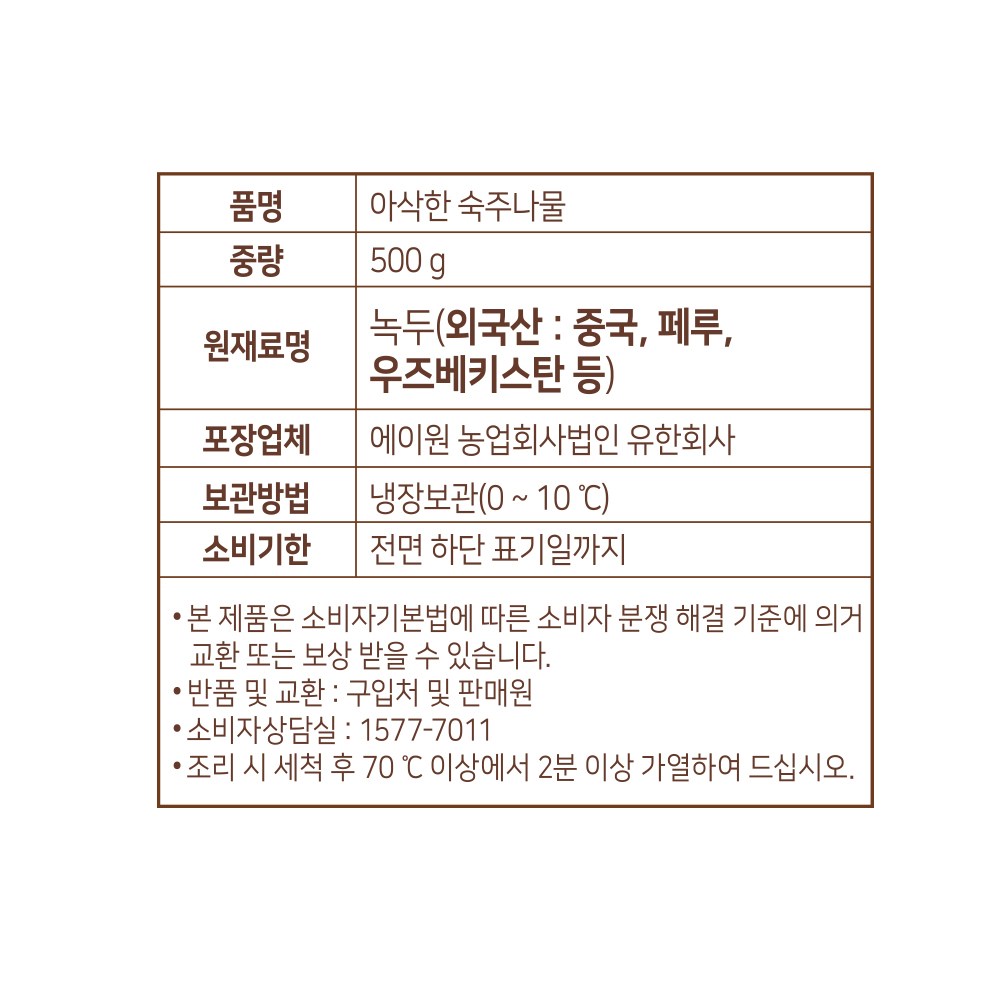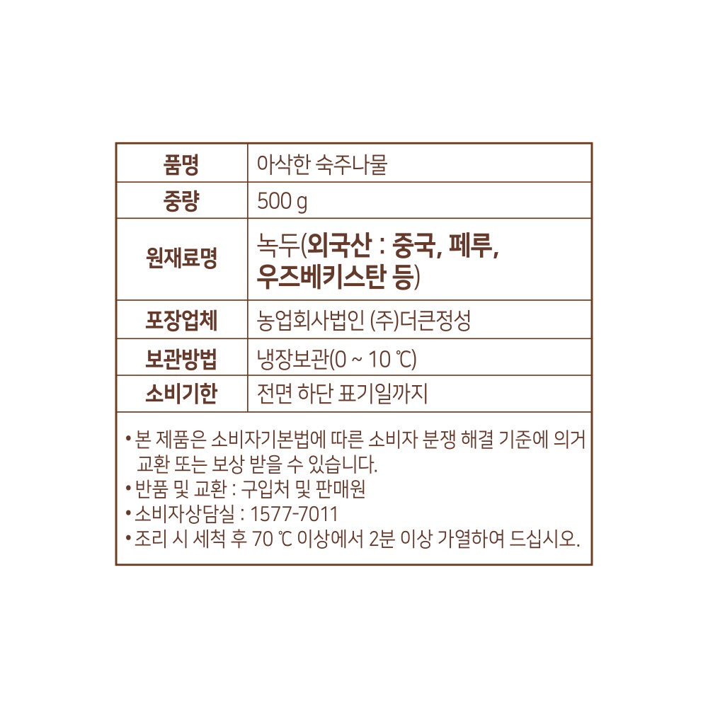 | 품목 또는 명칭 | 곰곰 아삭한 숙주나물 | 포장단위별 내용물의 용량(중량),수량,크기 | 500g x 2개 |