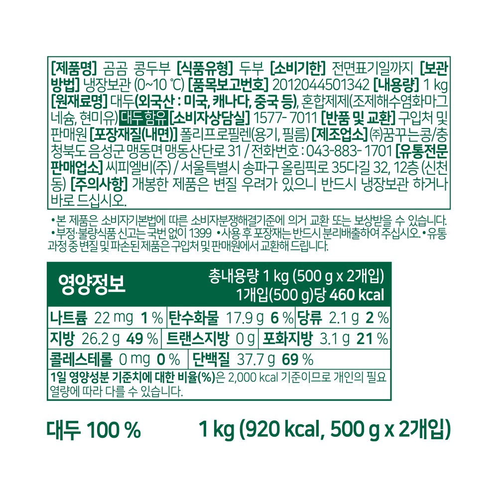 | 제품명 | 곰곰 콩두부 | 식품의 유형 | 두부 |