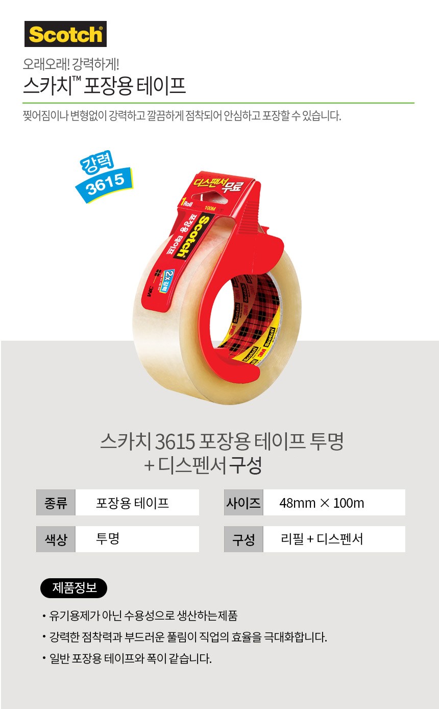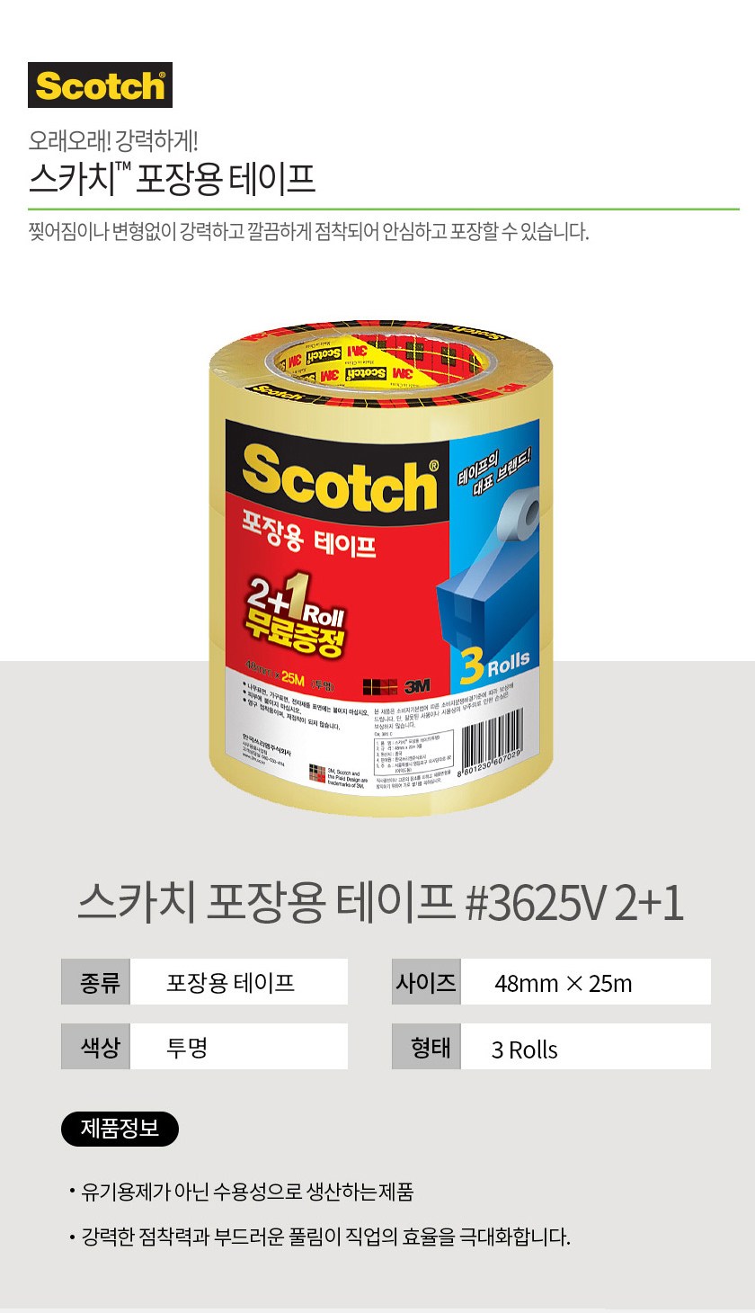 | 품명 및 모델명 | 스카치 포장 테이프 3625V 투명 (48mm x 25m) + 포장 테이프 3615R 투명(48mm × 100m) + 디스펜서 | 인증/허가 사항 | 해당없음 |
