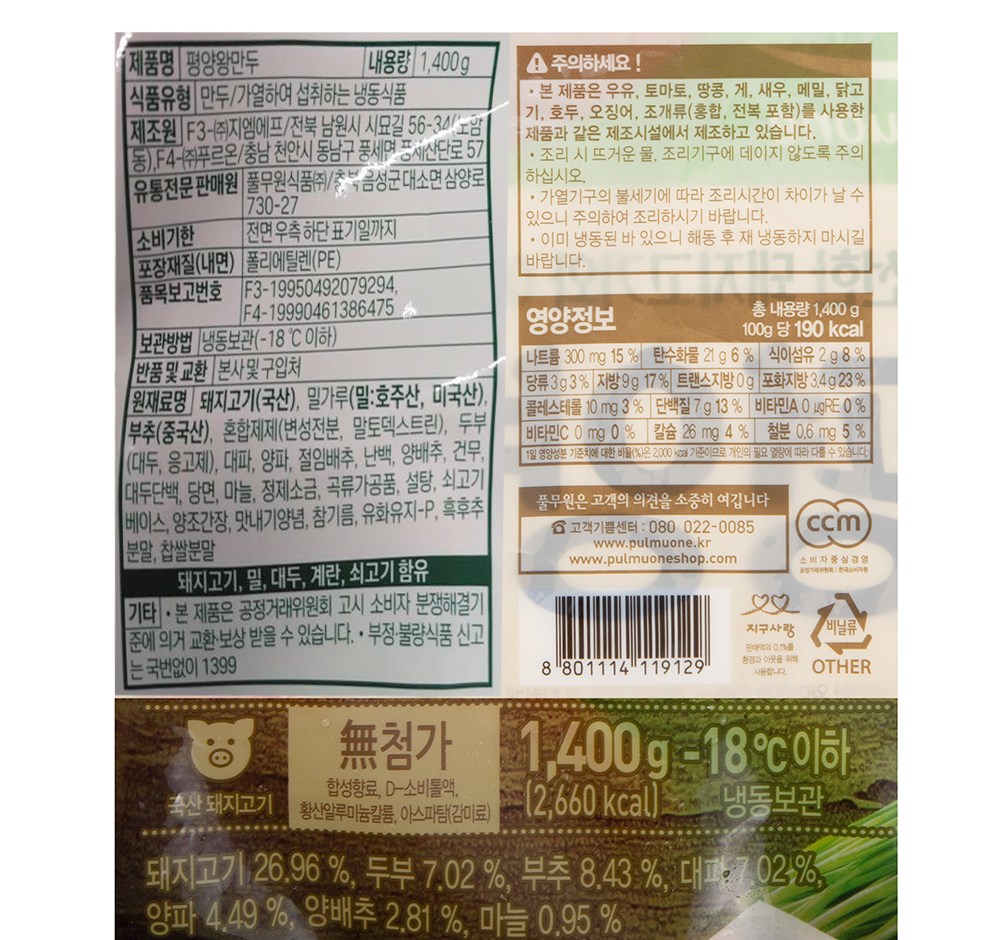 | 제품명 | 평양왕만두 | 식품의 유형 | 만두 / 가열하여 섭취하는 냉동식품 |