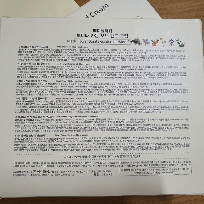 | 용량(중량) | 핸드크림 토레야 75ml + 킹 체리블로썸 75ml + 한라봉 75ml + 카놀라 75ml + 카모마일 75ml + 조릿대 75ml | 제품 주요 사양 | 모든피부용 |