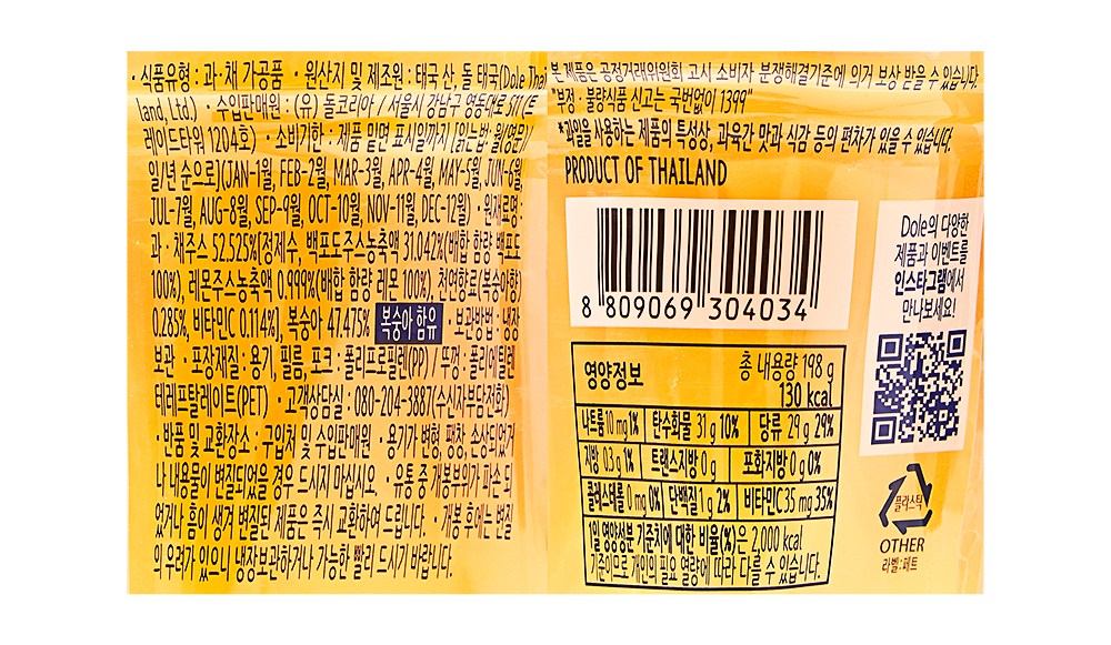 | 생산자 및 소재지 | Dole Thailand,Ltd. / (유)돌코리아 / 태국 | 소비기한 또는 품질유지기한 | 소비기한(또는 유통기한) : 2027년 04월 05일 이거나 그 이후인 상품 |