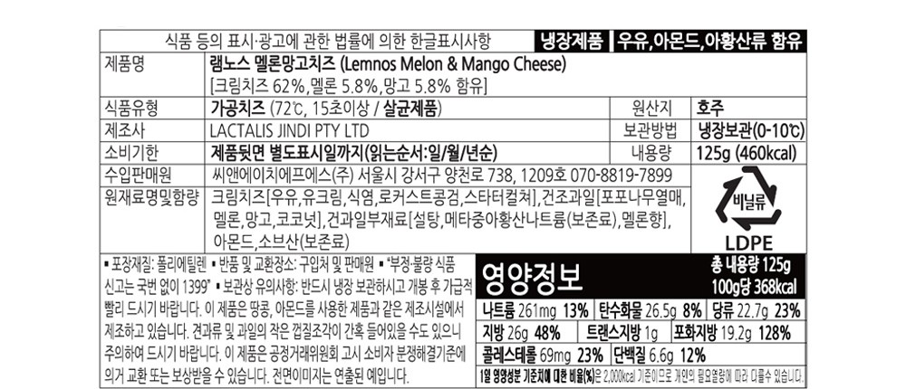 | 제품명 | 램노스 멜론망고 치즈 | 식품의 유형 | 가공치즈 (살균제품, 72ºC 이상에서 15초이상) |