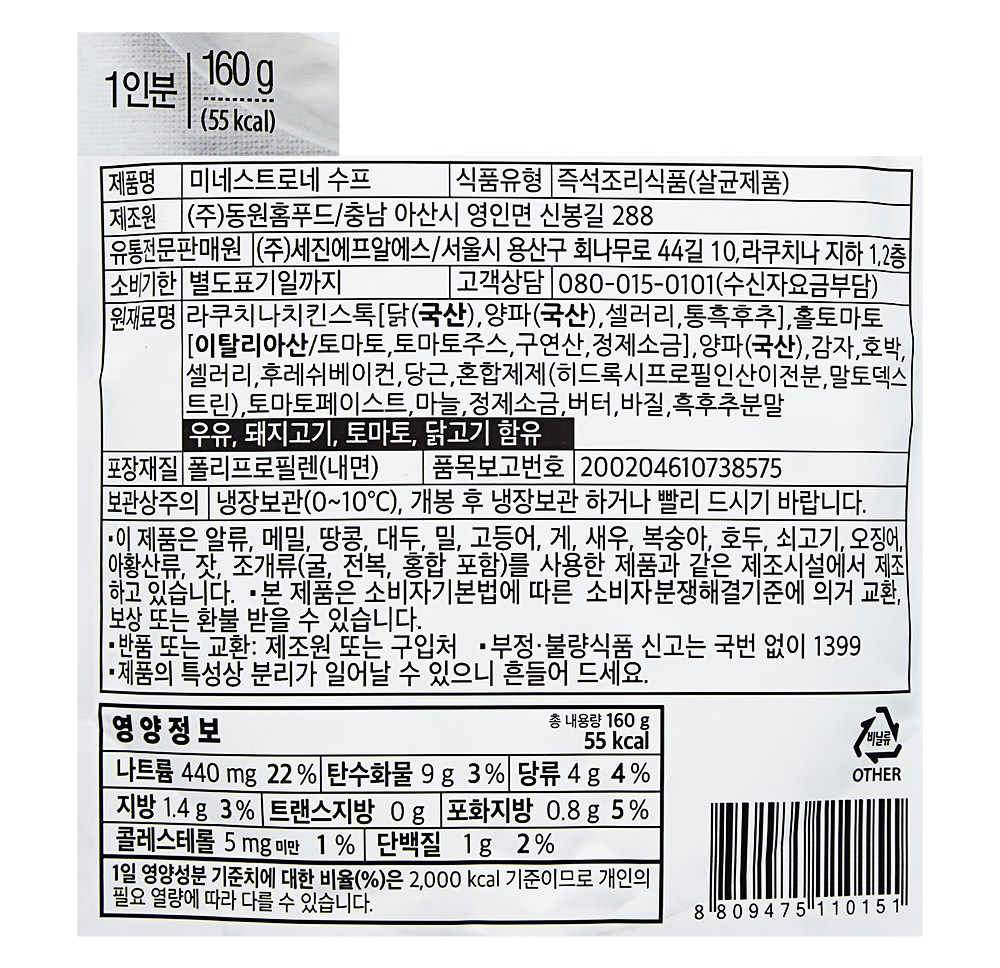 1990년부터 전통을 이어온 이탈리안 레스토랑, 라쿠치나의 노하우를 담은 미네스트로네 수프입니다. 홀토마토부터 양파, 감자, 호박, 셀러리 등 다양한 채소를 가득 넣은 후 뭉근하게 끓여내 깊은 맛이 일품이죠. 라쿠치나의 비법이 담긴 치킨스톡을 사용해 감칠맛도 살아있답니다. 전자레인지에 조리해 빵 혹은 크래커와 곁들여 즐겨보세요.
