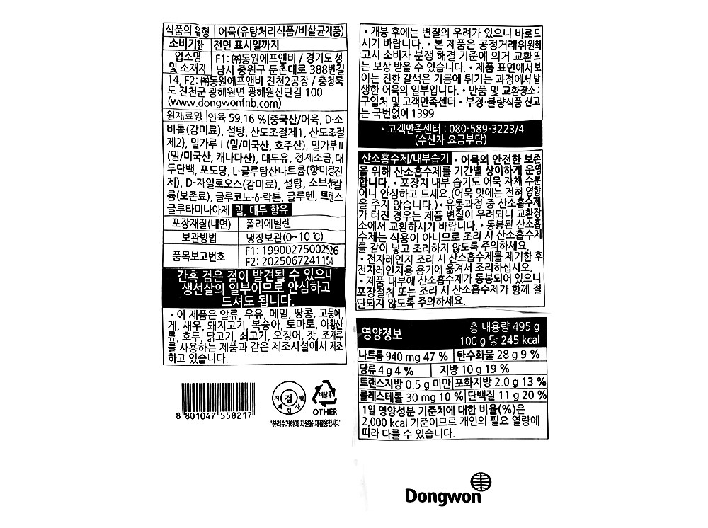 | 제품명 | 추억의 부산어묵 쫄깃사각 | 식품의 유형 | 어묵(유탕처리제품/비살균제품) |