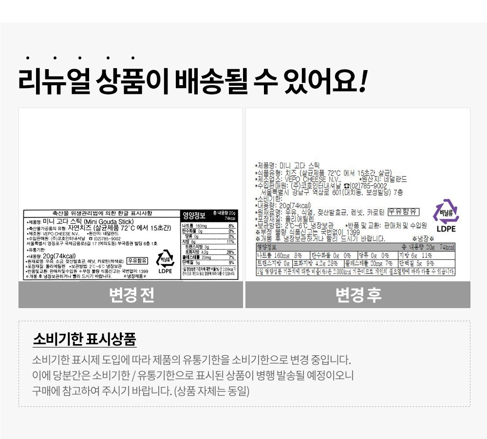 | 생산자 및 소재지 | VEPO CHEESE.N.V/ 코호인터내셔날 / 네덜란드 | 소비기한 또는 품질유지기한 | 소비기한(또는 유통기한) : 2026년 08월 19일 이거나 그 이후인 상품 |