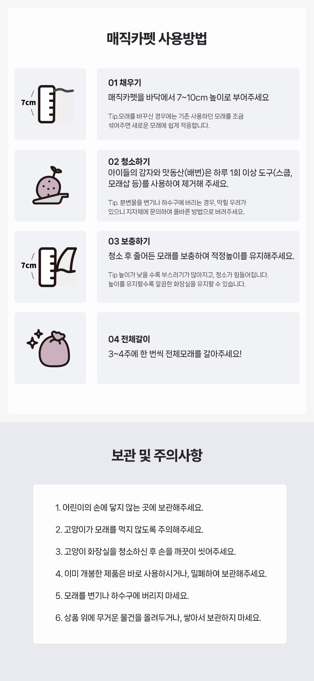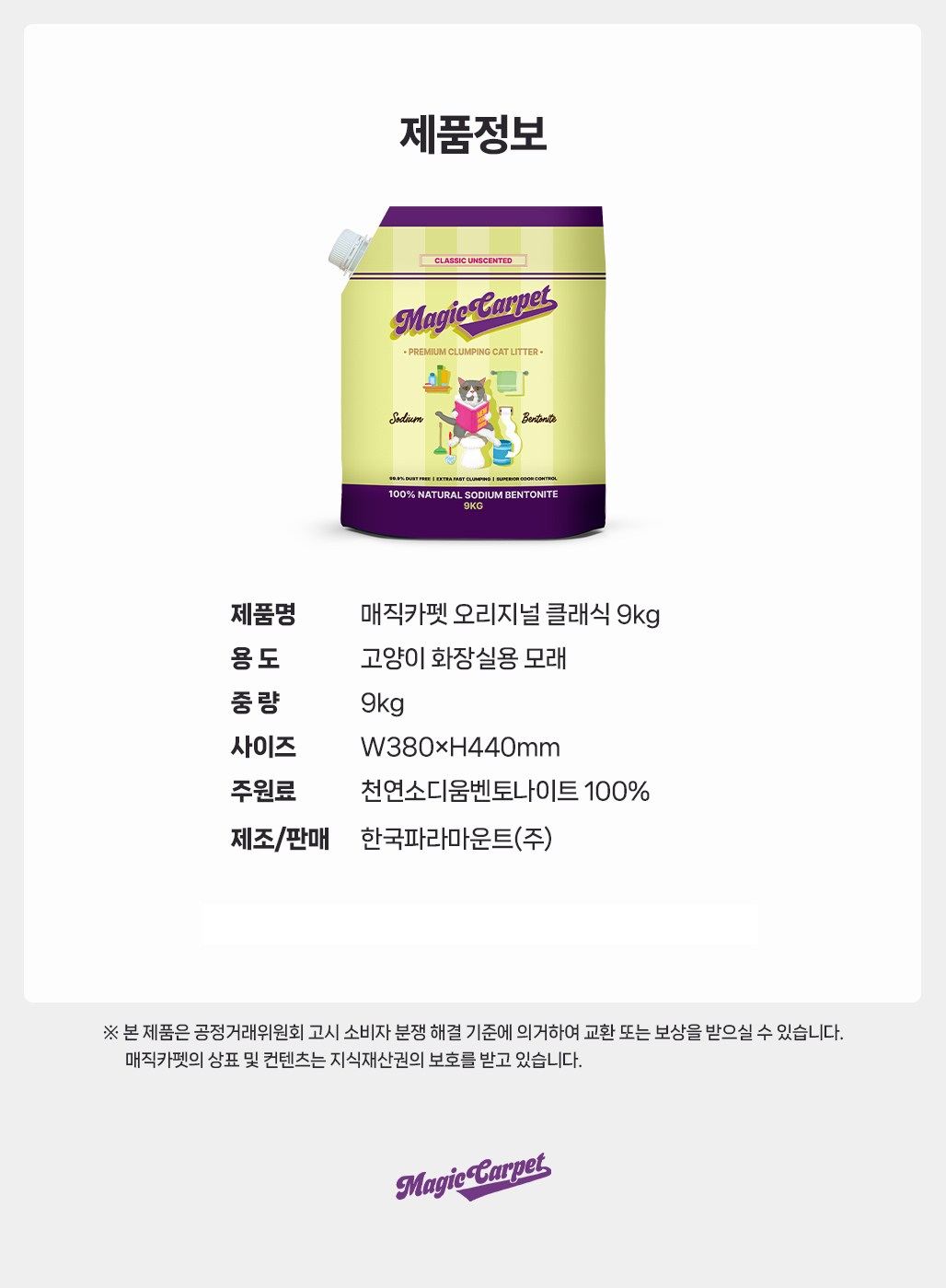 | 품명 및 모델명 | 매직카펫 고양이모래 중간입자 9kg | 인증/허가 사항 | 해당없음 |