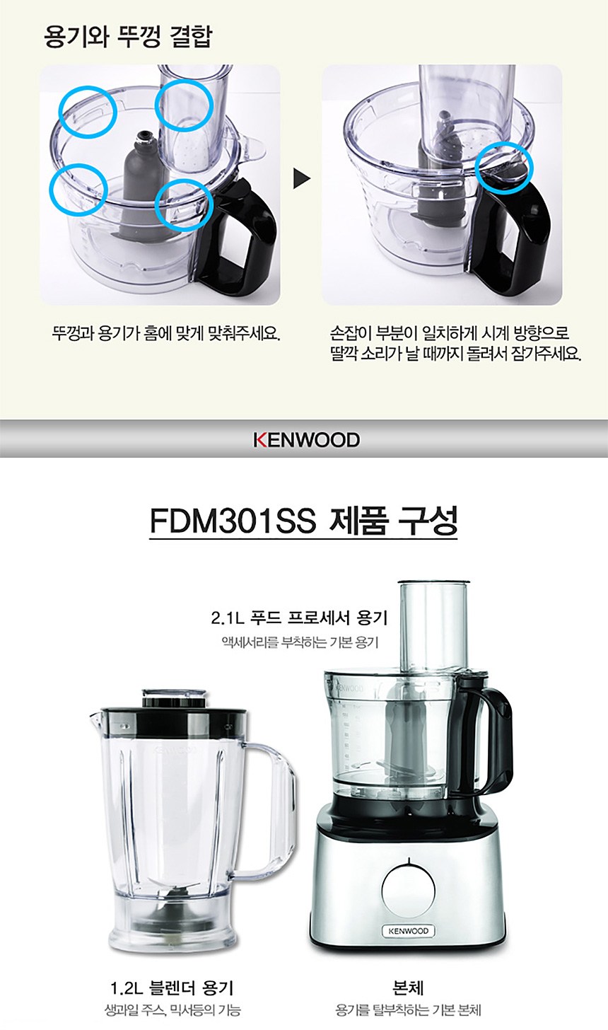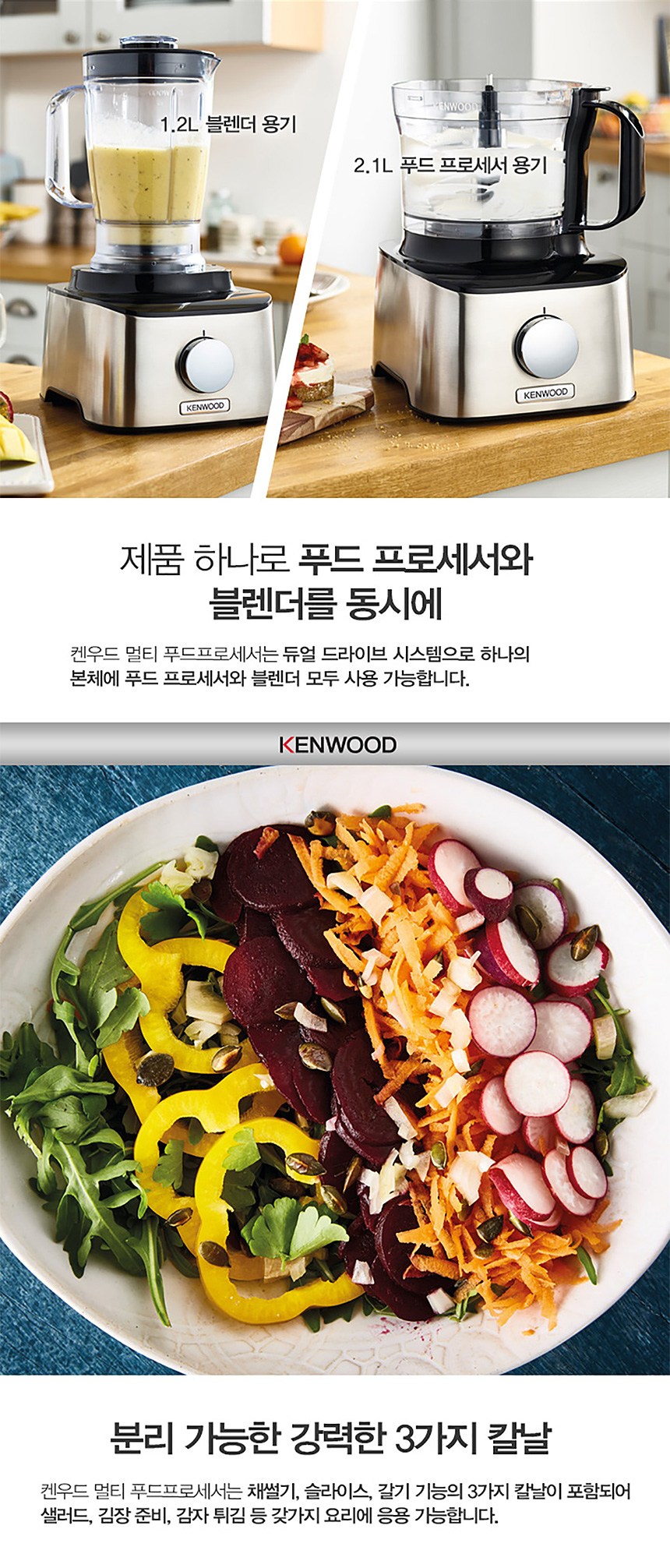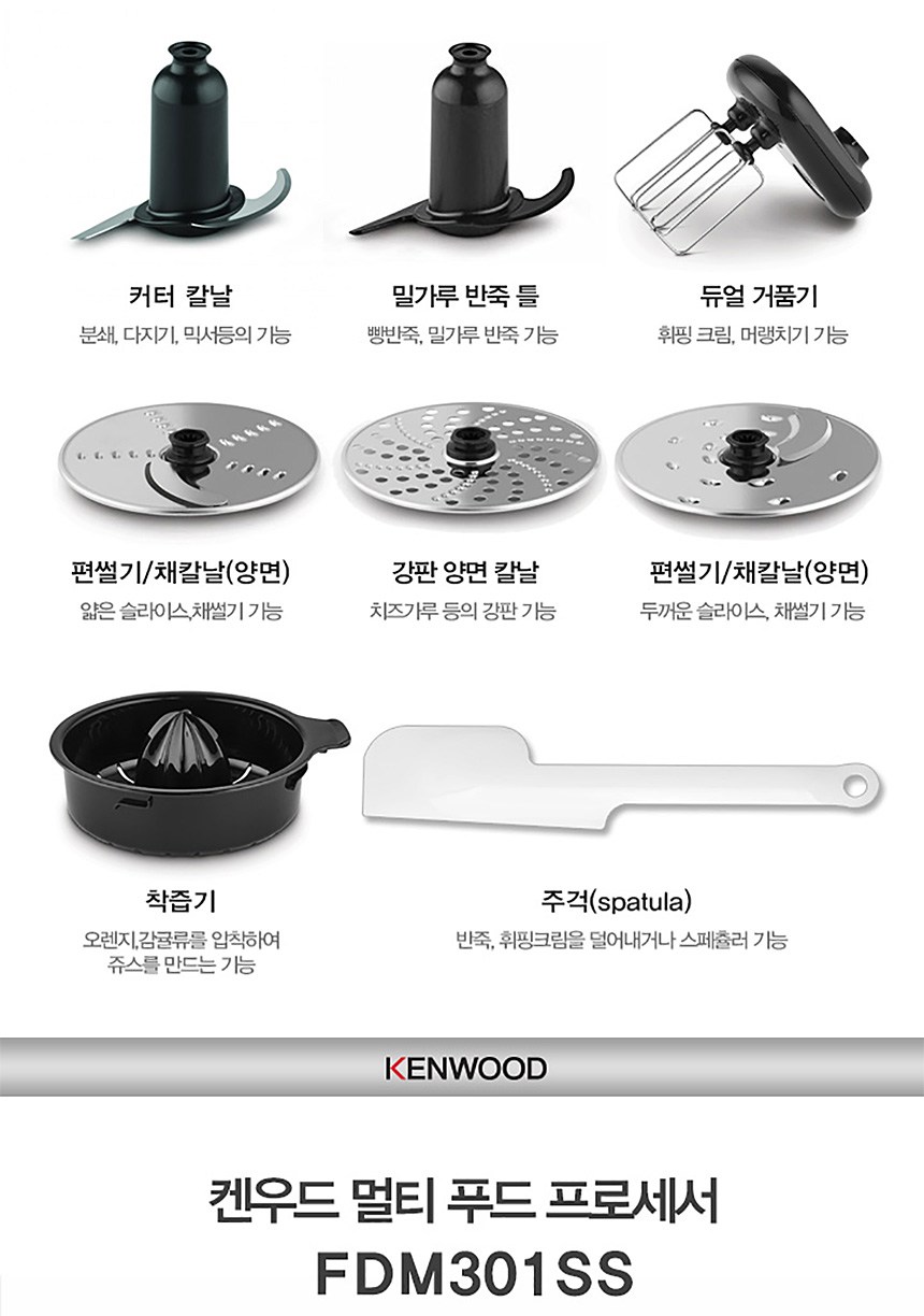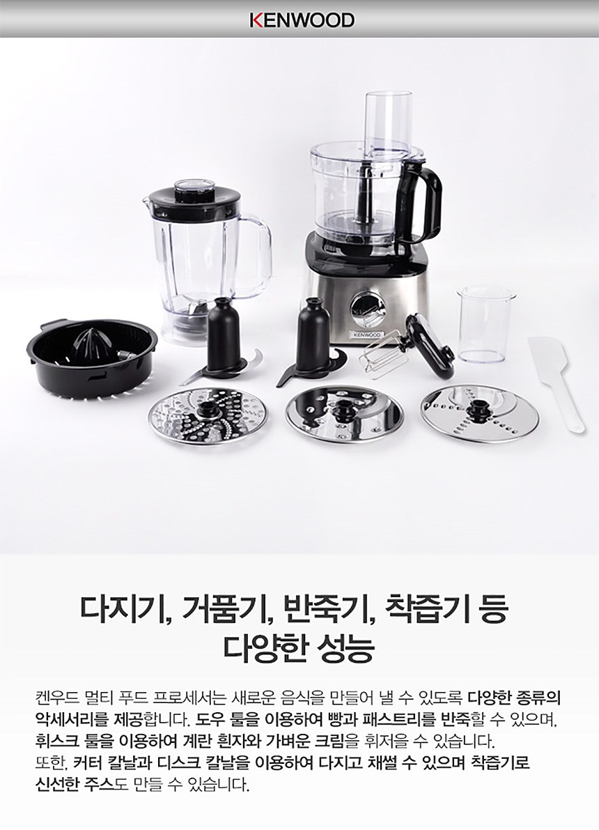 - 구성품: 본체 + 2.1L 푸드 프로세서 용기 + 1.2L 블렌더 용기 + 커터 칼날 + 밀가루 반죽 틀 + 듀얼 거품기 + 얇은 편썰기/채칼날(양면) + 강판 양면 칼날 + 두꺼운 편썰기/채칼날(양면) + 착즙기 + 주걱