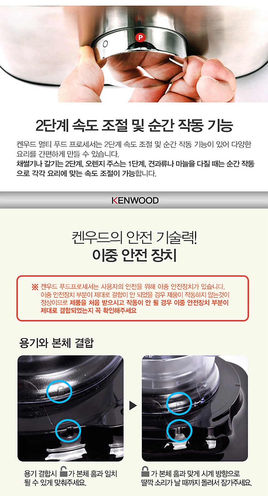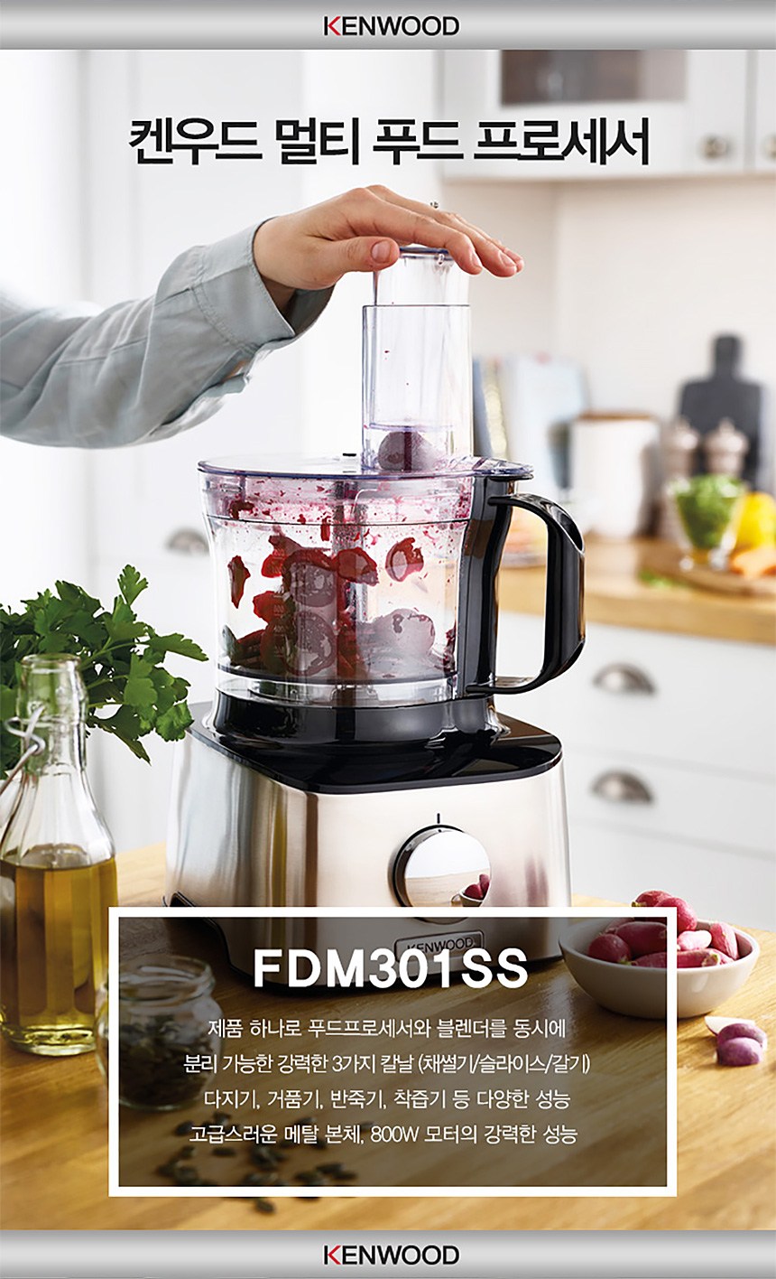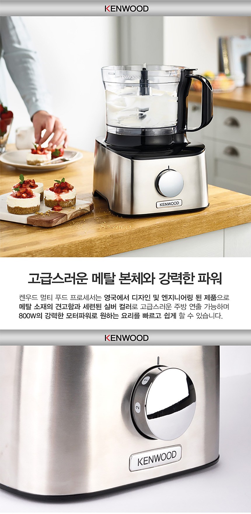- 구성품: 본체 + 2.1L 푸드 프로세서 용기 + 1.2L 블렌더 용기 + 커터 칼날 + 밀가루 반죽 틀 + 듀얼 거품기 + 얇은 편썰기/채칼날(양면) + 강판 양면 칼날 + 두꺼운 편썰기/채칼날(양면) + 착즙기 + 주걱