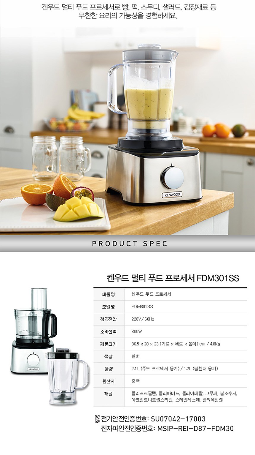 | 품명 및 모델명 | 켄우드 멀티 푸드 프로세서 / FDM301SS | KC 인증정보 | SU07042-17003 / MSIP-REI-D87-FDM30 |