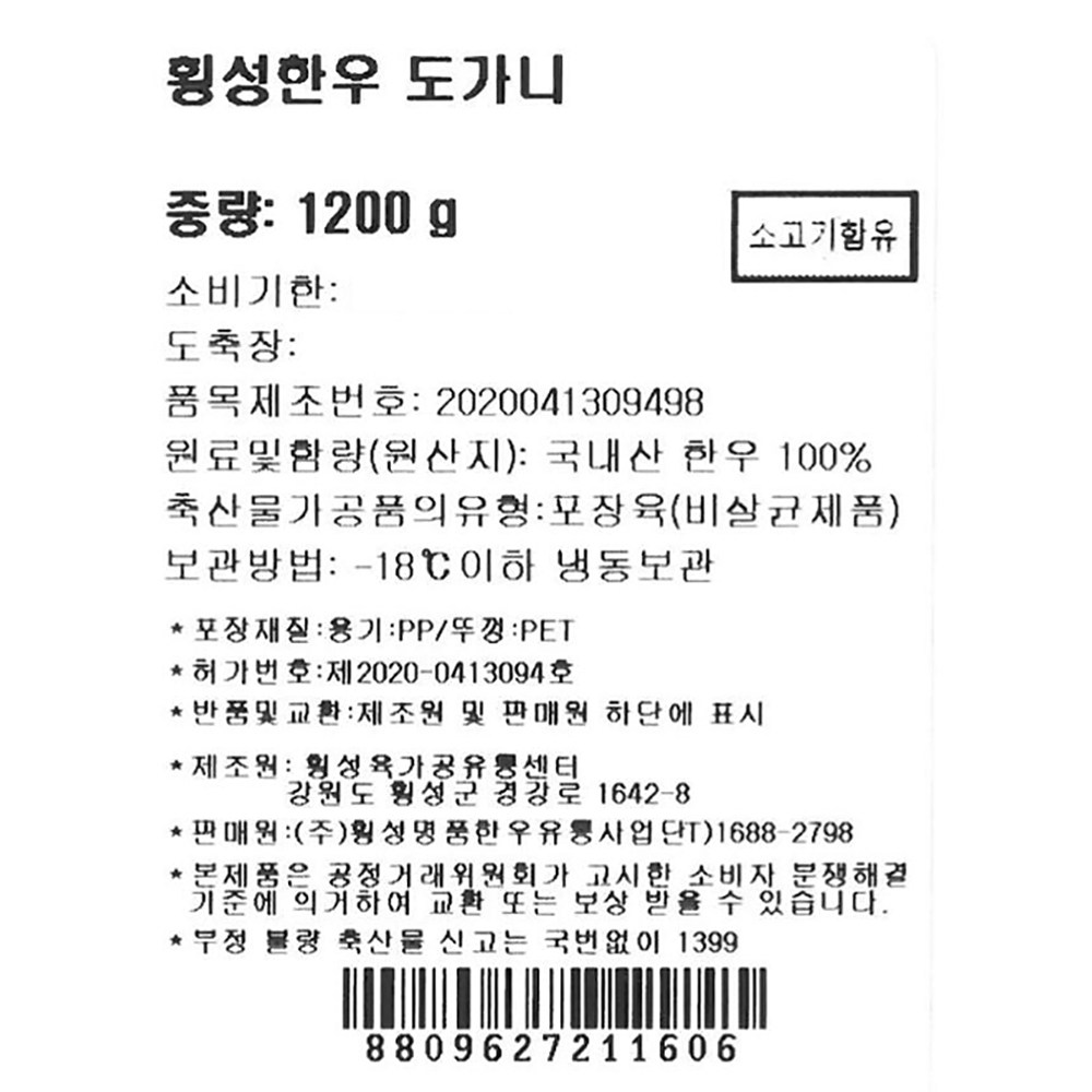 | 품목 또는 명칭 | 횡성한우 도가니 | 포장단위별 내용물의 용량(중량),수량,크기 | 1.2kg, 1개, 신선 식품이므로 수량과 크기는 상이할 수 있습니다. |
