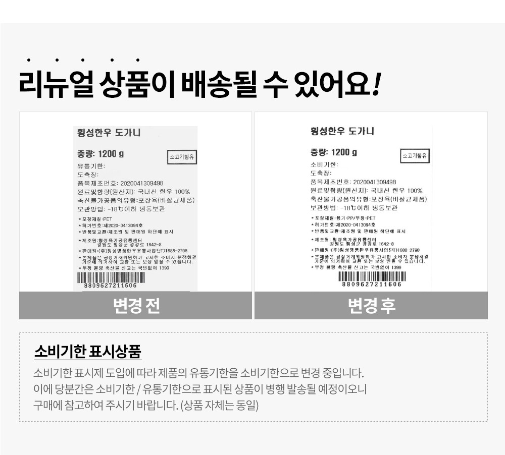 | 소비기한 또는 품질유지기한 | 소비기한(또는 유통기한) : 2026년 09월 14일 이거나 그 이후인 상품 | 세부 품목군별 표시사항 | 축산물 등급표시: 업체미제공 / 이력번호 표시유무 - 해당없음 |