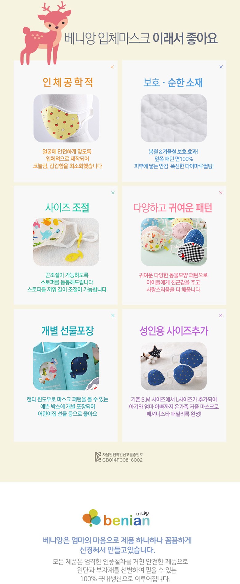 | 품명 및 모델명 | 베니앙 유아동 입체마스크 당근이좋아-M | KC 인증정보 | CB014F008-6002 |