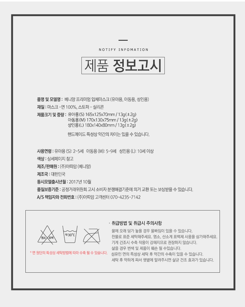 | 색상 | 피치 | 재질 | 마스크: 면100%, 스토퍼:실리콘100% |