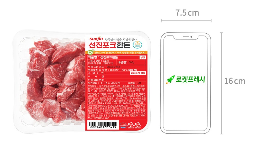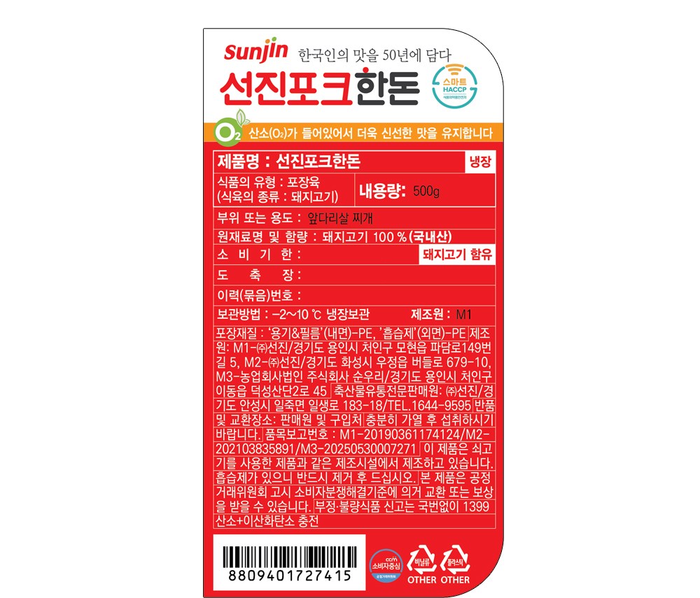 | 품목 또는 명칭 | 선진포크한돈 | 포장단위별 내용물의 용량(중량),수량,크기 | 500g x 2팩,1개 |