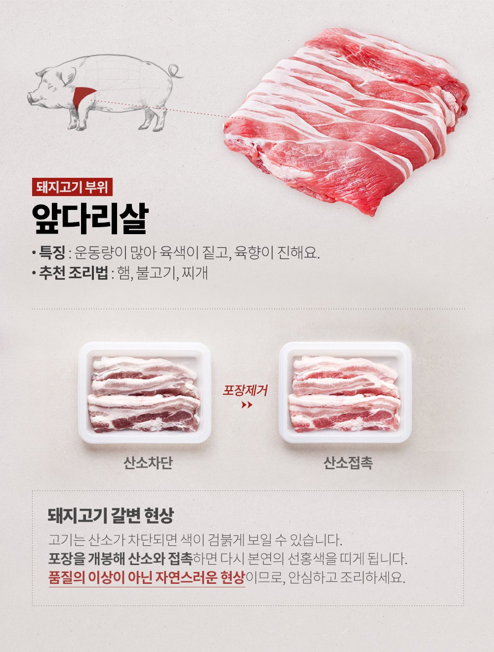 찌개용으로 깔끔하게 손질된 앞다리살이에요. 특유의 찰진 식감과 짙은 육향을 자랑하는 부위인데요. 살짝 도톰하게 썰려 있어, 국에 넣으면 진한 국물 맛을 우려낼 수 있답니다. 각종 찌개 요리에 넣어 푹 끓여보세요. 크기가 적당하고, 감칠맛이 좋아 자꾸만 쏙쏙 건져 먹게 될 거예요.