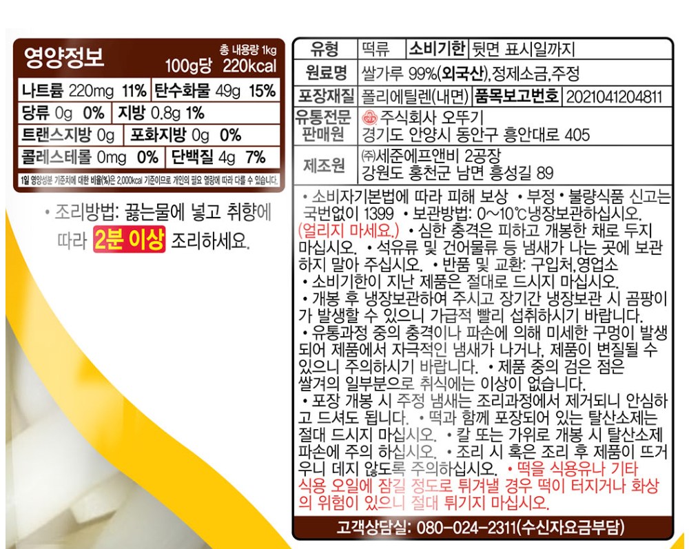 | 제품명 | 오뚜기 오쉐프 쌀떡볶이떡 | 식품의 유형 | 떡류 |